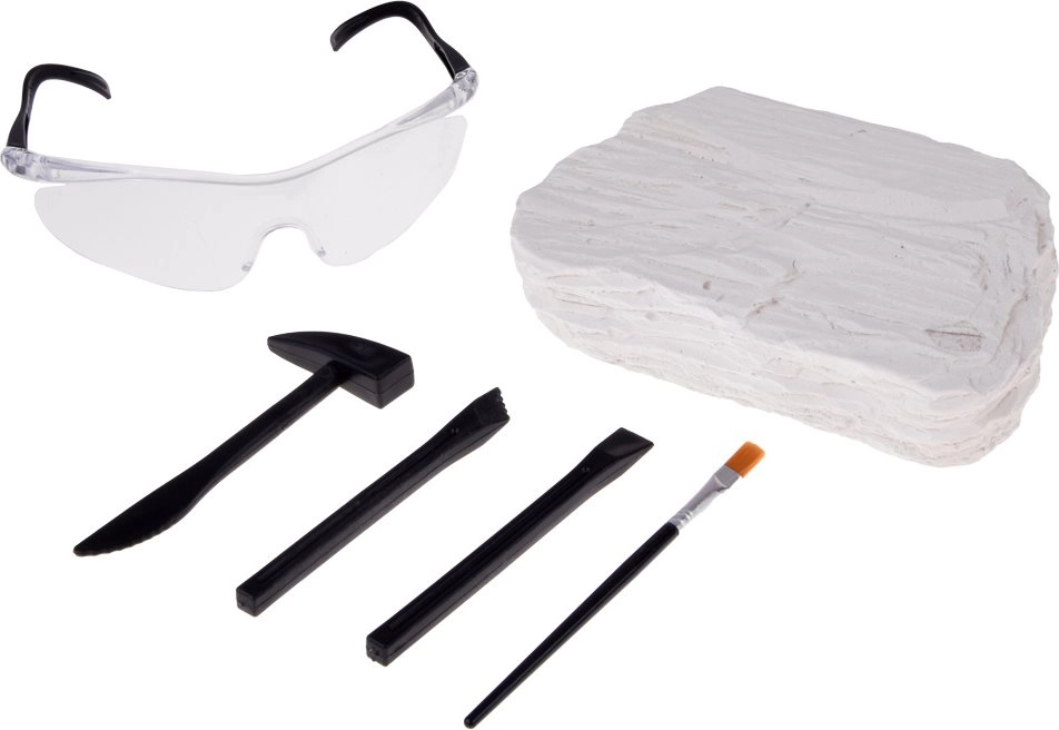 Περιλαμβάνεται ανθεκτικό γύψινο μπλοκ και προστατευτικά γυαλιά που προστατεύουν τα μάτια κατά την αποκάλυψη του απολιθώματος. Ιδανικό για ασφαλή αρχαιολογία στο σπίτι.