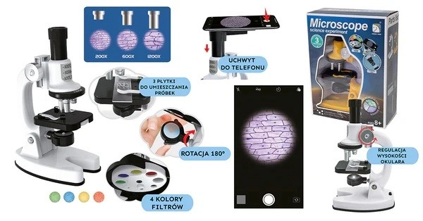 Ανακαλύψτε τον συναρπαστικό κόσμο γύρω μας με αυτό το ποιοτικό παιδικό μικροσκόπιο. Προσφέρει 3 επίπεδα μεγέθυνσης 200×/600×/1200×, 4 έγχρωμα φίλτρα για καλύτερη αντίθεση και βάση για τηλέφωνο για άνετη φωτογράφιση δειγμάτων. Ιδανικό δώρο για μικρούς εξερευνητές και αρχάριους επιστήμονες.