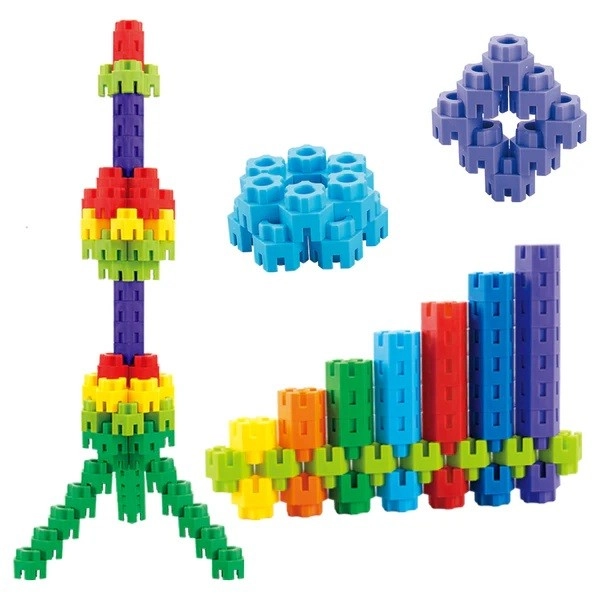 Η σύνδεση των κομματιών δυναμώνει τα δάχτυλα και τον συντονισμό χεριού–ματιού, ενώ η κατασκευή σύμφωνα με τη φαντασία αναπτύσσει τον προγραμματισμό και τη χωρική σκέψη.