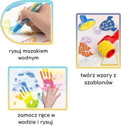 Το σετ περιλαμβάνει πλούσια αξεσουάρ που διευρύνουν τις δυνατότητες παιχνιδιού – από υδάτινους μαρκαδόρους και σφραγίδες μέχρι ρολάκι με σχέδια και στένσιλ γραμμάτων και σχημάτων. Όλα είναι ελαφριά, εύκολα στην αποθήκευση και κατάλληλα για το σπίτι ή το ταξίδι.
