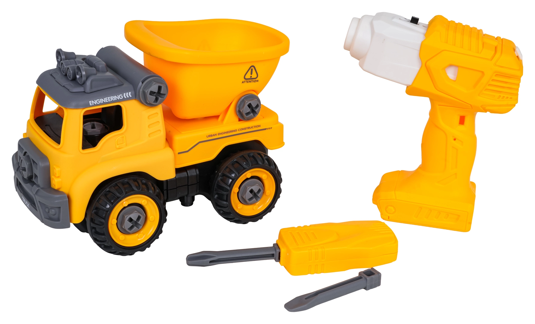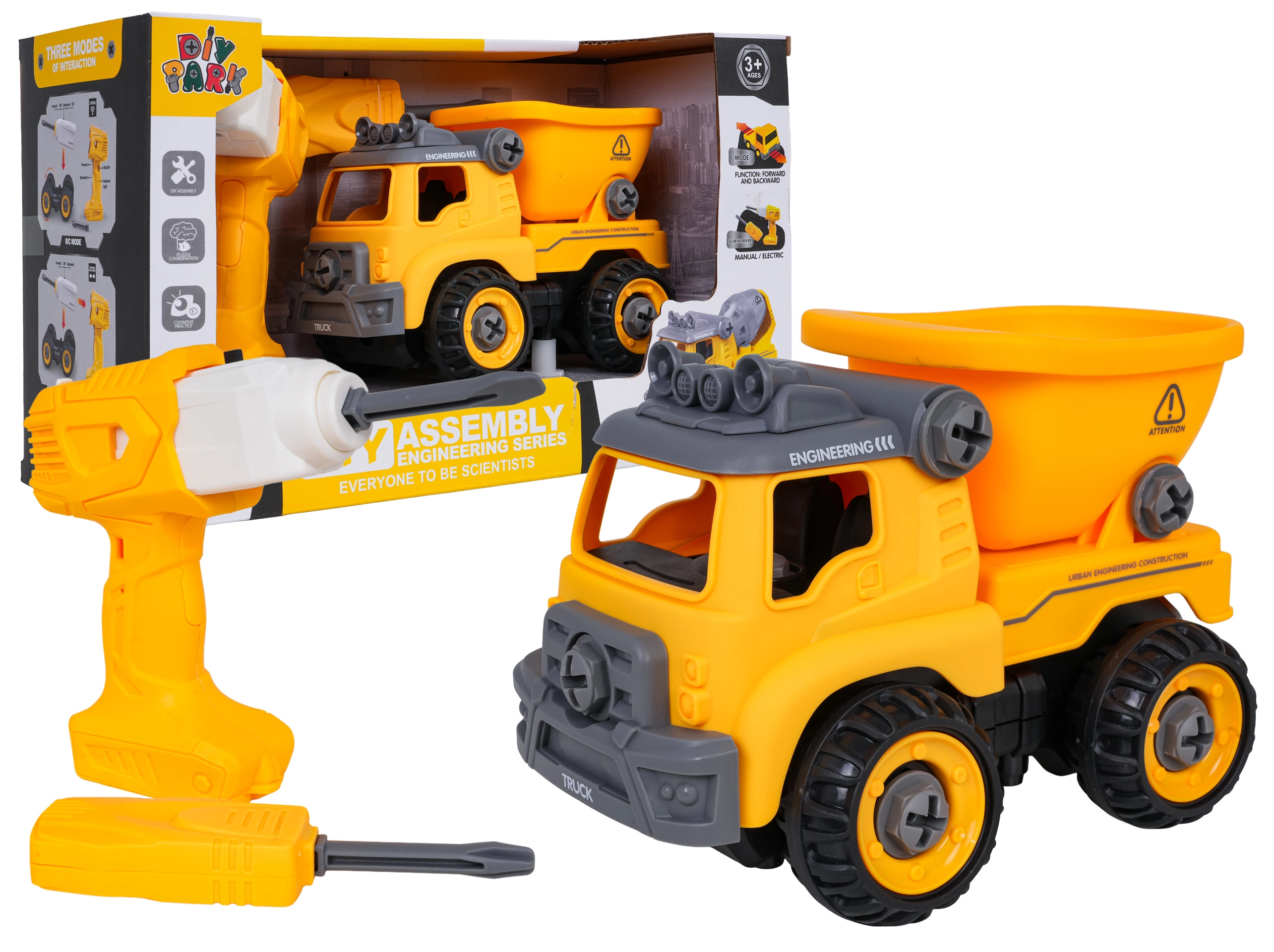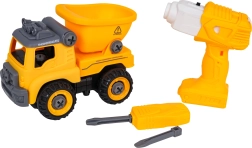 Διασκεδαστικό αποσυναρμολογούμενο κατασκευαστικό φορτηγάκι για παιδιά από 3 ετών με μπαταριοκίνητο δράπανο και χειροκίνητο κατσαβίδι. Τα παιδιά μπορούν εύκολα να αποσυναρμολογήσουν και να συναρμολογήσουν ξανά το όχημα, εξασκώντας έτσι τη λεπτή κινητικότητα, τη λογική σκέψη και την δημιουργικότητα. Με την τοποθέτηση του πίνακα ελέγχου, το αυτοκίνητο κινείται μόνο του εμπρός και πίσω, διαθέτει ανατρεπόμενη καρότσα και ανοιγόμενη οροφή.