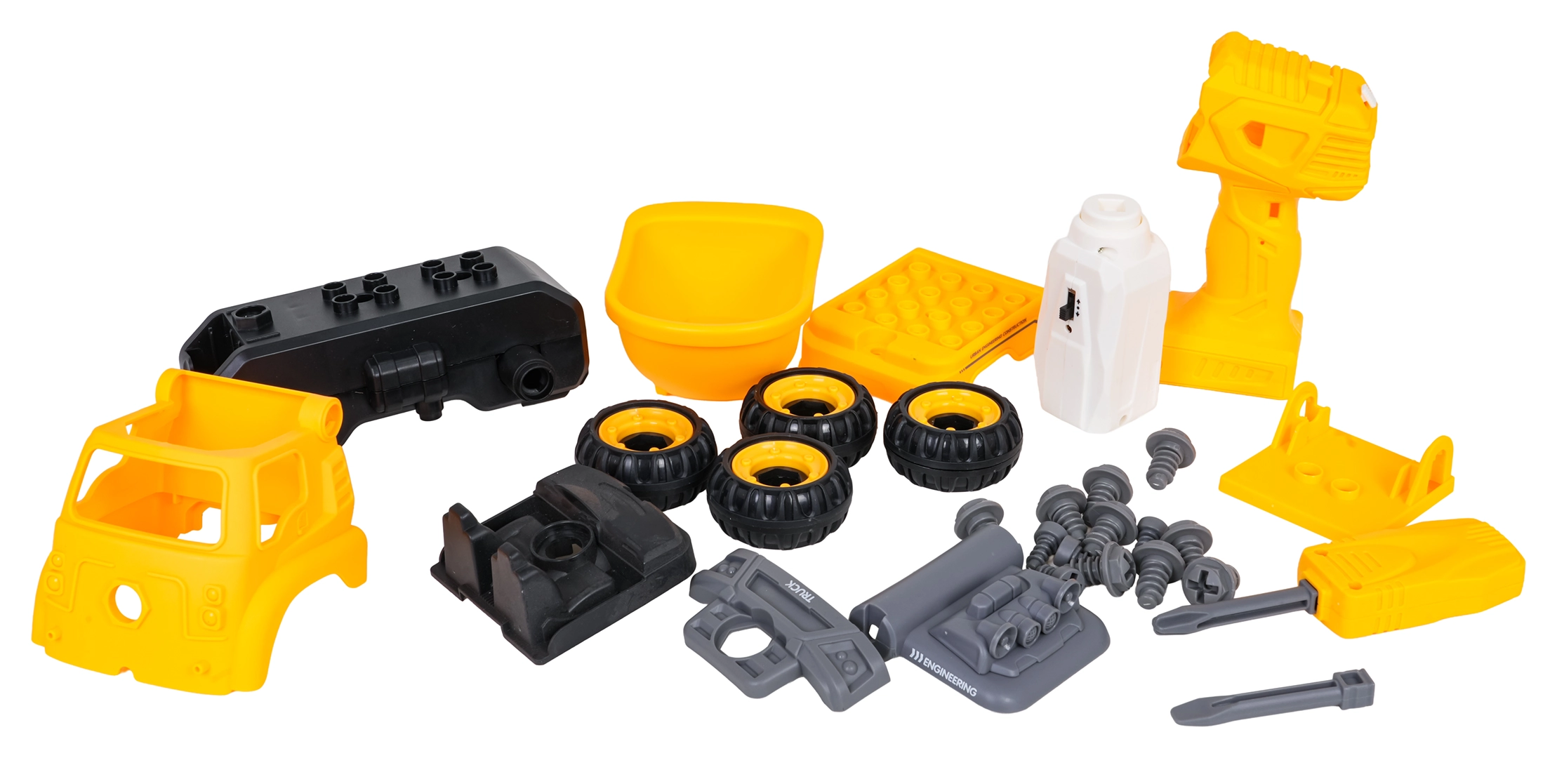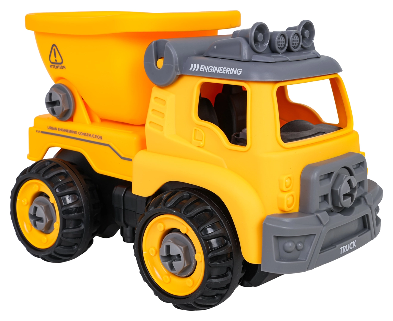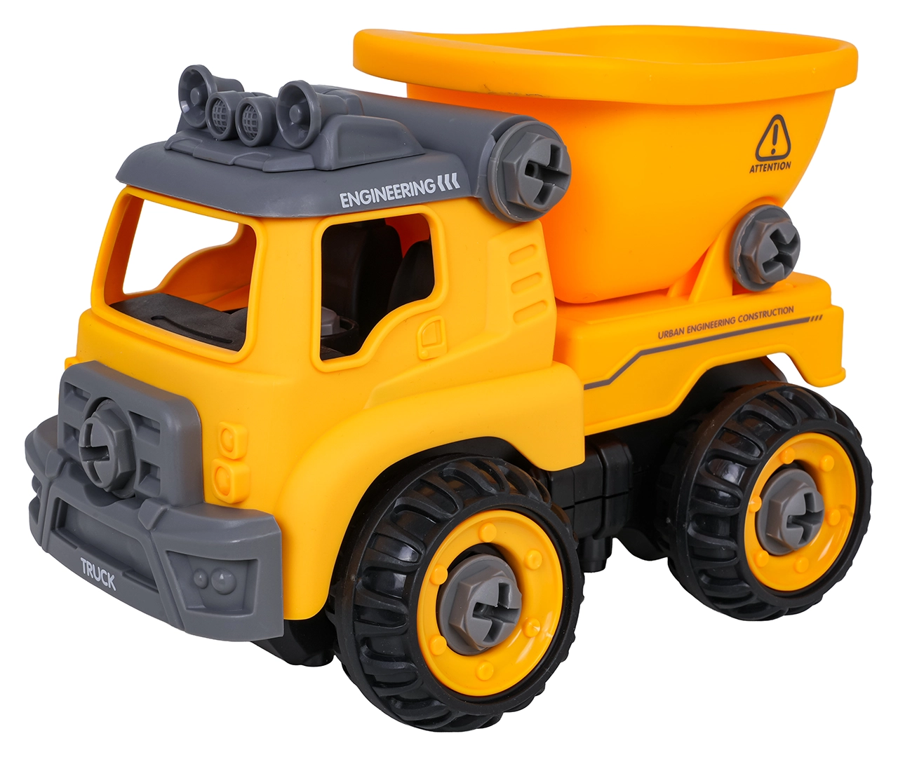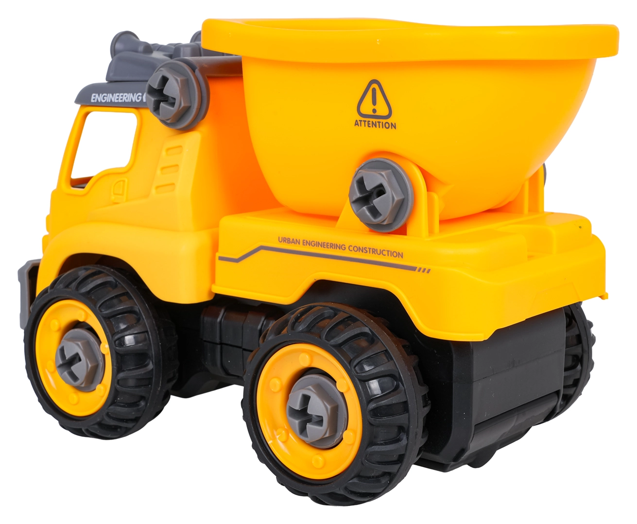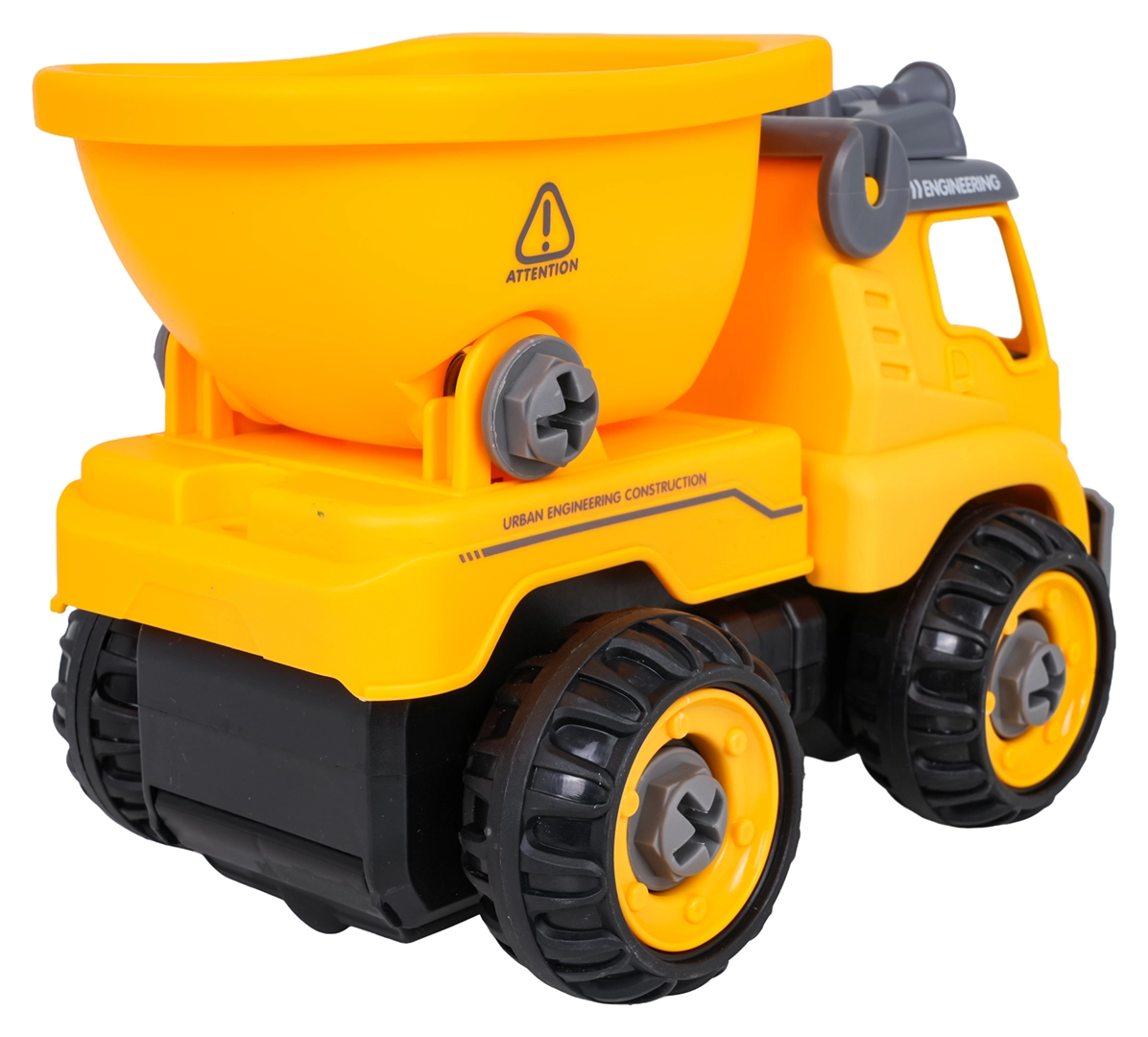 Το κατασκευαστικό ανατρεπόμενο παραδίδεται πλήρως συναρμολογημένο και έτοιμο για παιχνίδι. Με το παρεχόμενο μπαταριοκίνητο δράπανο και το χειροκίνητο κατσαβίδι, τα παιδιά μπορούν να το αποσυναρμολογήσουν σε επιμέρους κομμάτια και να το συναρμολογήσουν ξανά. Το όχημα είναι κατασκευασμένο από ανθεκτικό πλαστικό σε ζωντανά χρώματα, ώστε να αντέχει το καθημερινό παιχνίδι.
