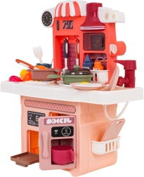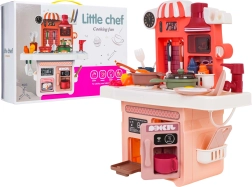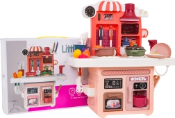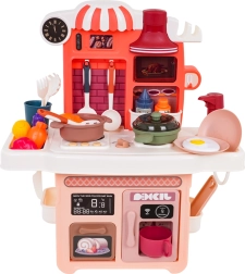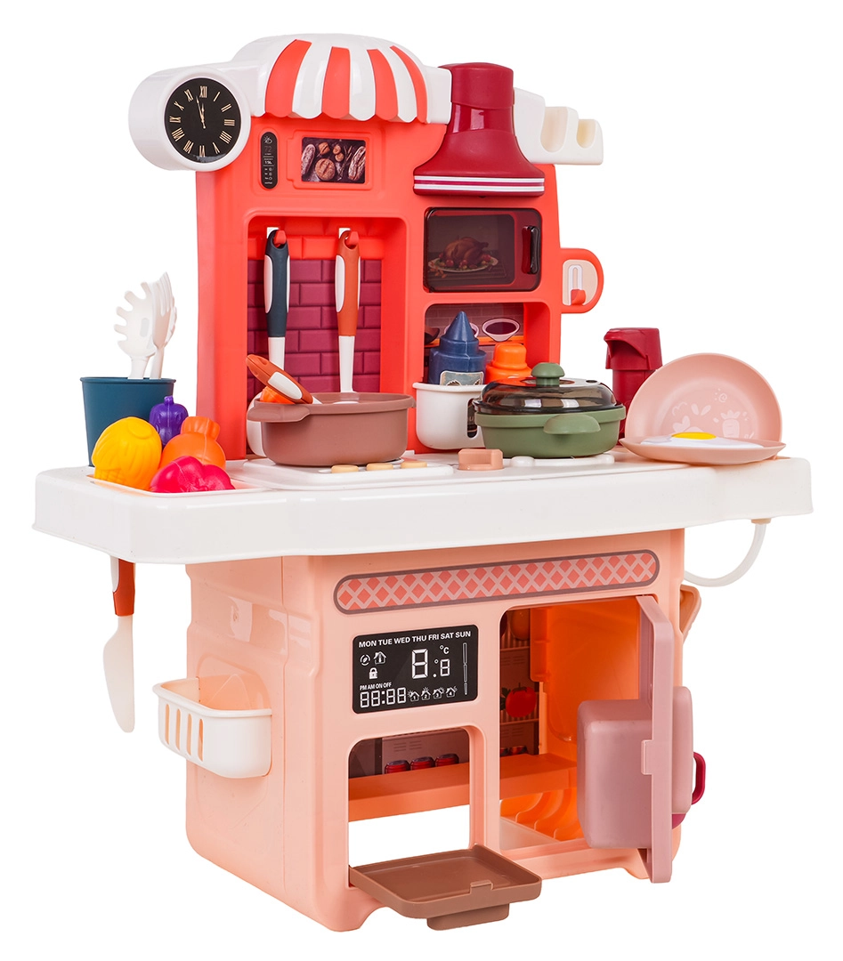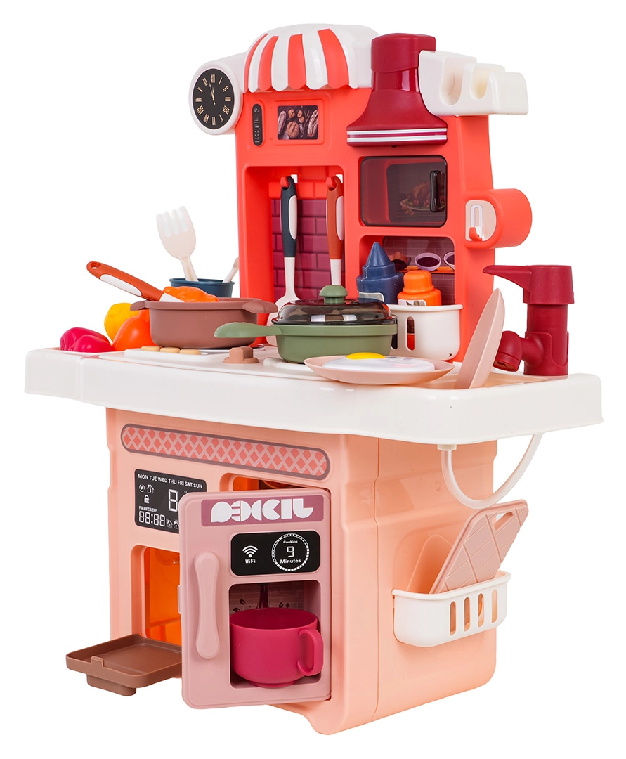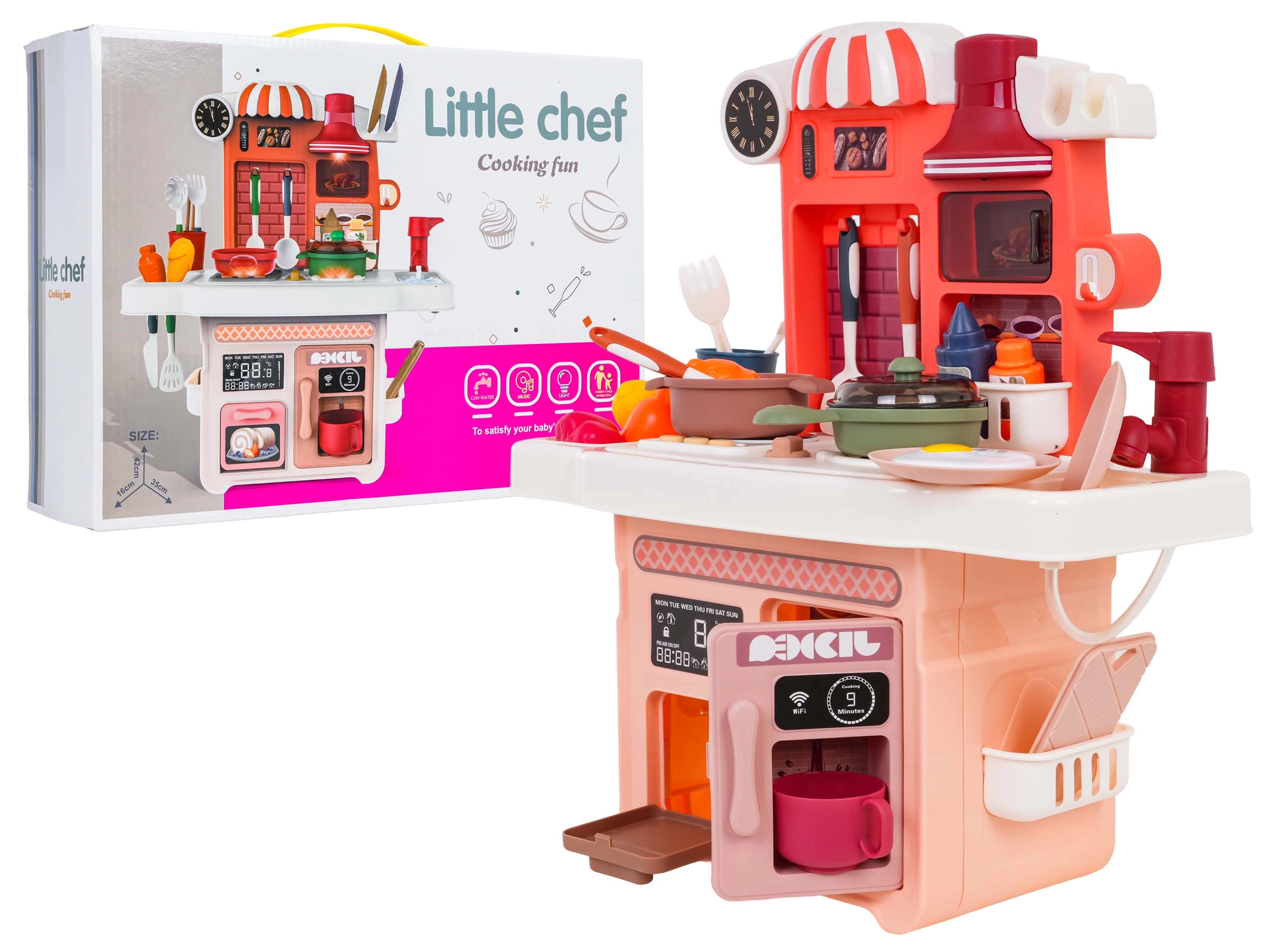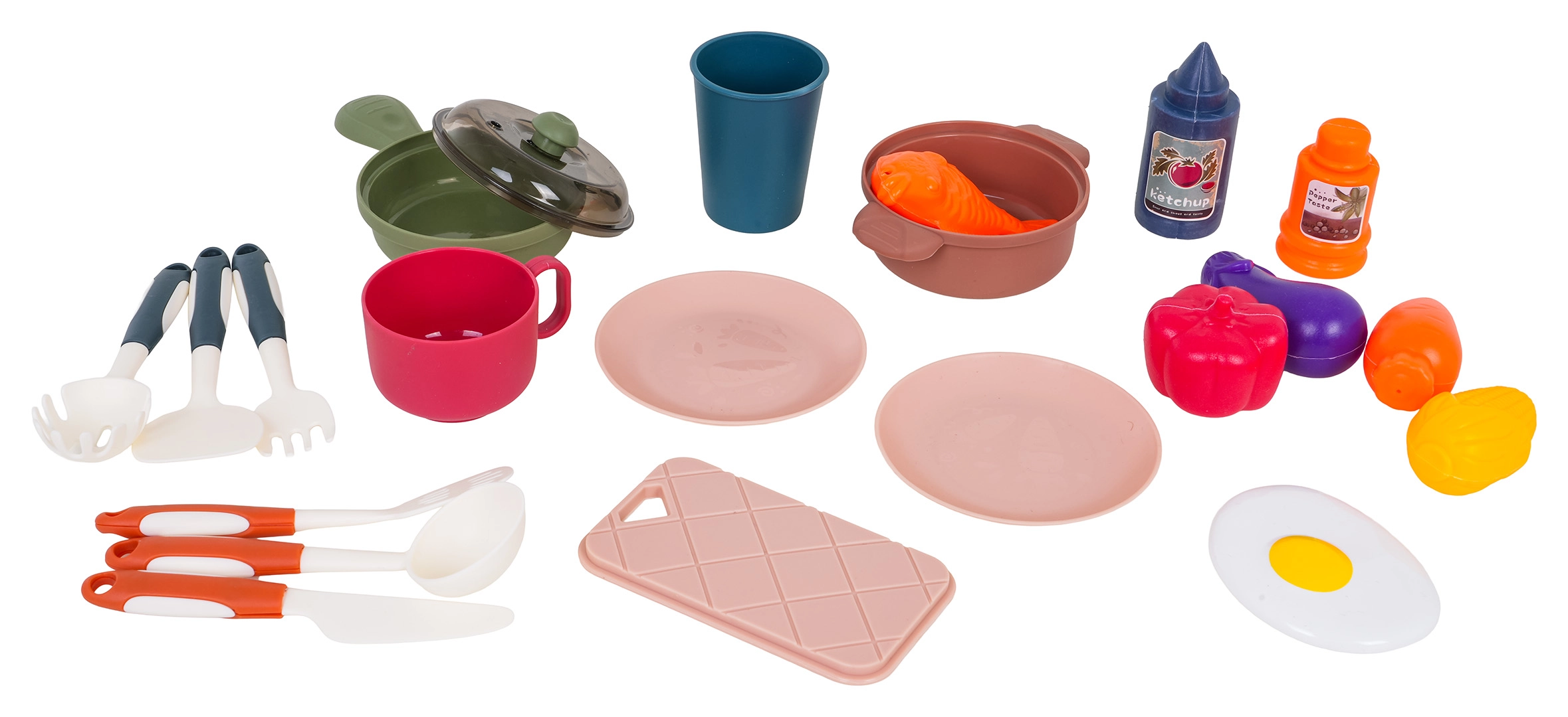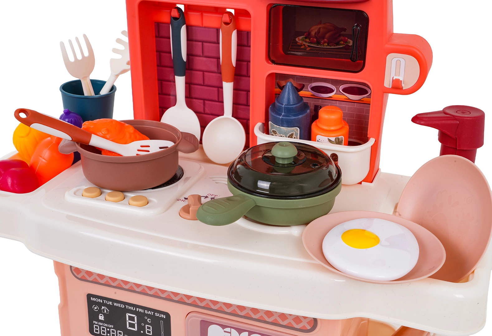 Το απόλυτο ατού είναι η λειτουργική βρύση – από την αντλία με μπαταρίες ρέει νερό στον νεροχύτη, ώστε τα παιδιά να μπορούν να «πλένουν τα πιάτα» όπως σε πραγματική κουζίνα. Περιλαμβάνει επίσης ανοιγόμενο φούρνο, απομίμηση καφετιέρας και φωτιζόμενο απορροφητήρα. Τα πλούσια αξεσουάρ (κατσαρόλες, τηγάνι, κουζινικά, πιατάκια και τρόφιμα) επεκτείνουν τις δυνατότητες παιχνιδιού.