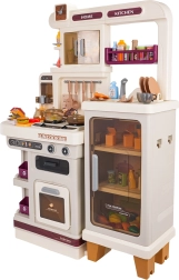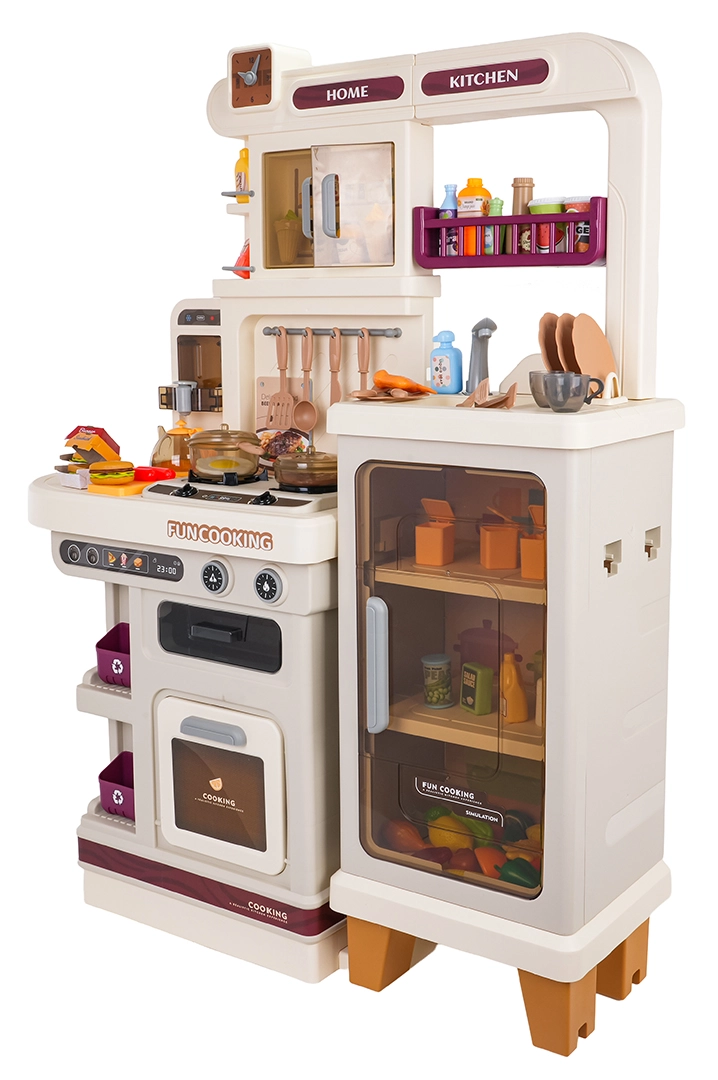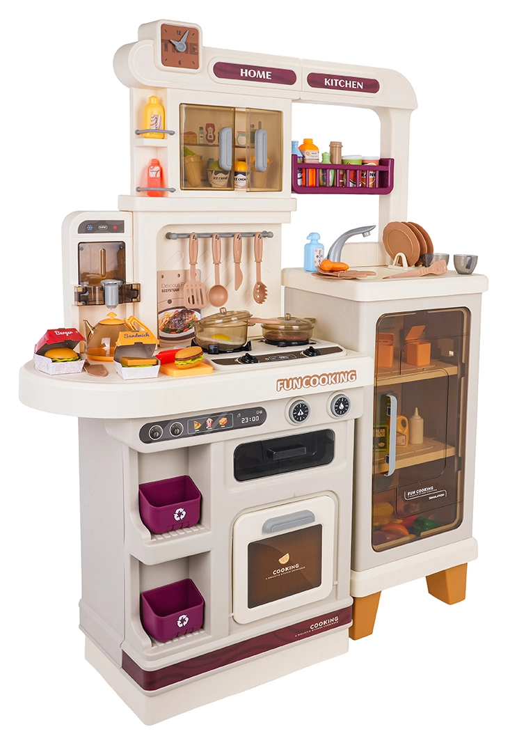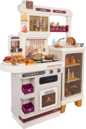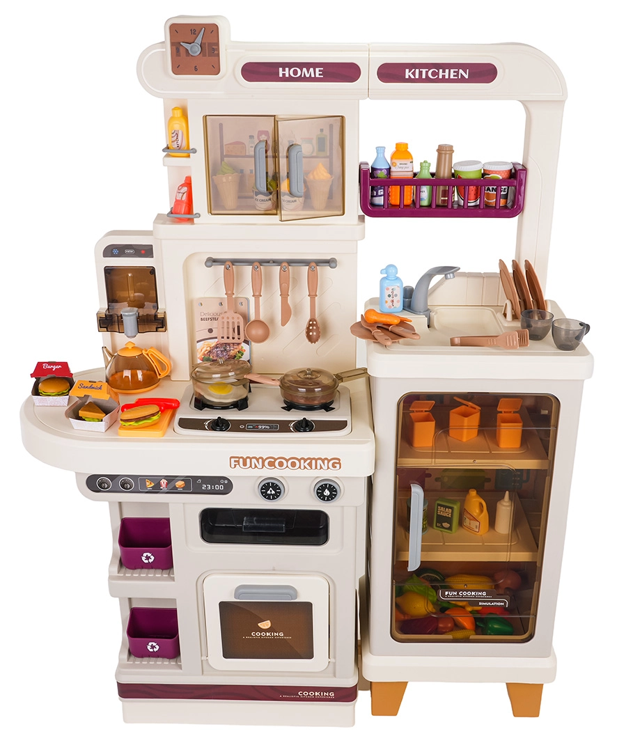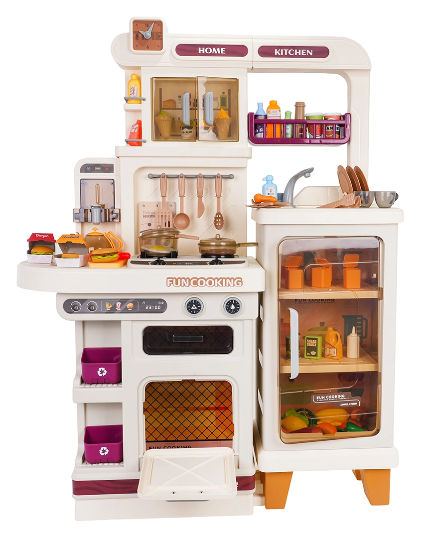 Αυτή η πολυλειτουργική κουζινούλα σε κομψό μπεζ χρώμα είναι κατασκευασμένη από ποιοτικό, ανθεκτικό πλαστικό και ενθουσιάζει κάθε παιδί με τις ρεαλιστικές της λειτουργίες. Οι φωτιζόμενες εστίες παράγουν ήχους μαγειρέματος και τηγανίσματος, από μία εστία αναδύεται απαλός ατμός και από τη λειτουργική βρύση τρέχει νερό. Ο ανοιγόμενος φούρνος και το ψυγείο μαζί με ράφια και γαντζάκια κρατούν όλα τα αξεσουάρ τακτοποιημένα στη θέση τους.