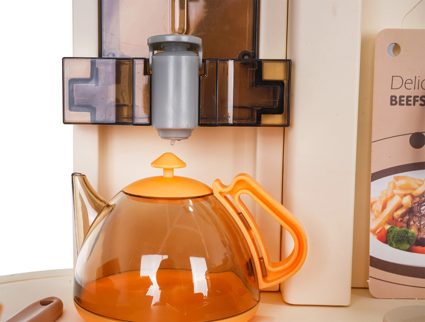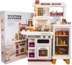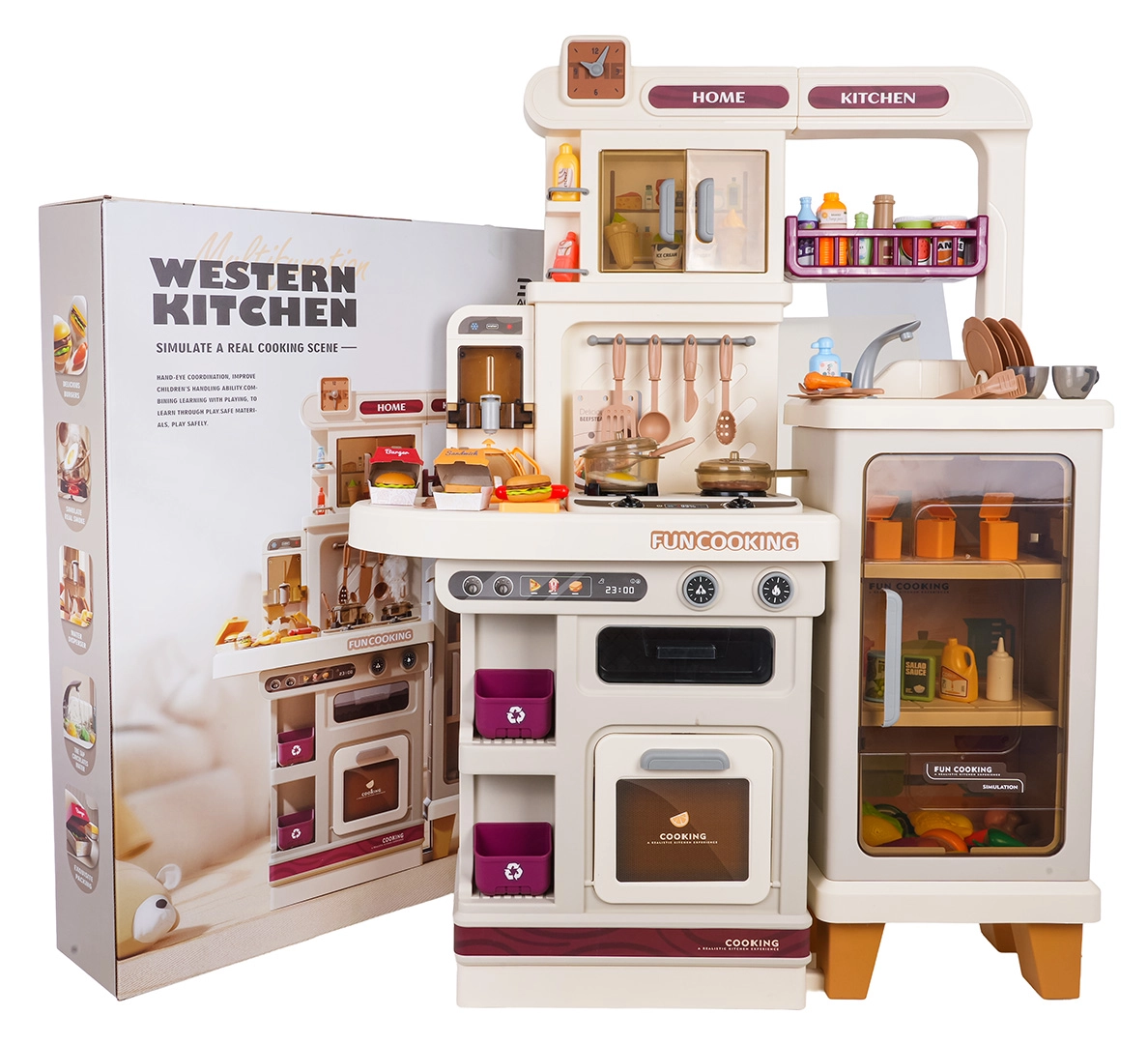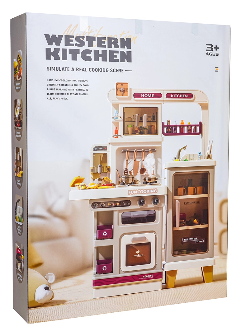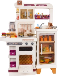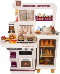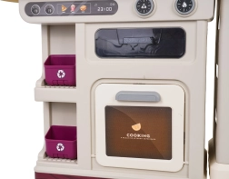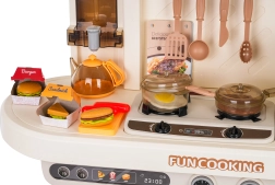 Αυτή η πολυλειτουργική κουζινούλα σε κομψό μπεζ χρώμα είναι κατασκευασμένη από ποιοτικό, ανθεκτικό πλαστικό και ενθουσιάζει κάθε παιδί με τις ρεαλιστικές της λειτουργίες. Οι φωτιζόμενες εστίες παράγουν ήχους μαγειρέματος και τηγανίσματος, από μία εστία αναδύεται απαλός ατμός και από τη λειτουργική βρύση τρέχει νερό. Ο ανοιγόμενος φούρνος και το ψυγείο μαζί με ράφια και γαντζάκια κρατούν όλα τα αξεσουάρ τακτοποιημένα στη θέση τους.