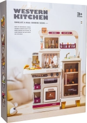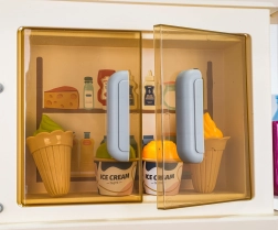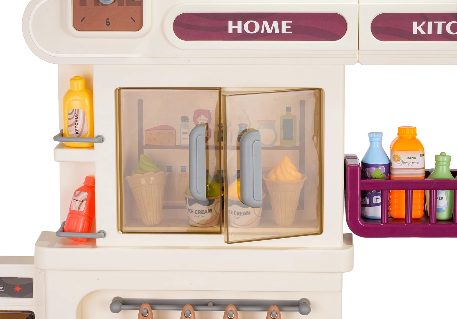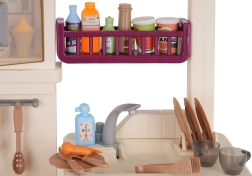 Από τη βρύση τρέχει πραγματικά νερό, ενώ το ψυγείο, ο φούρνος, τα ντουλάπια και τα ράφια χωρούν όλα τα αξεσουάρ και κρατούν τη γωνιά παιχνιδιού τακτοποιημένη.