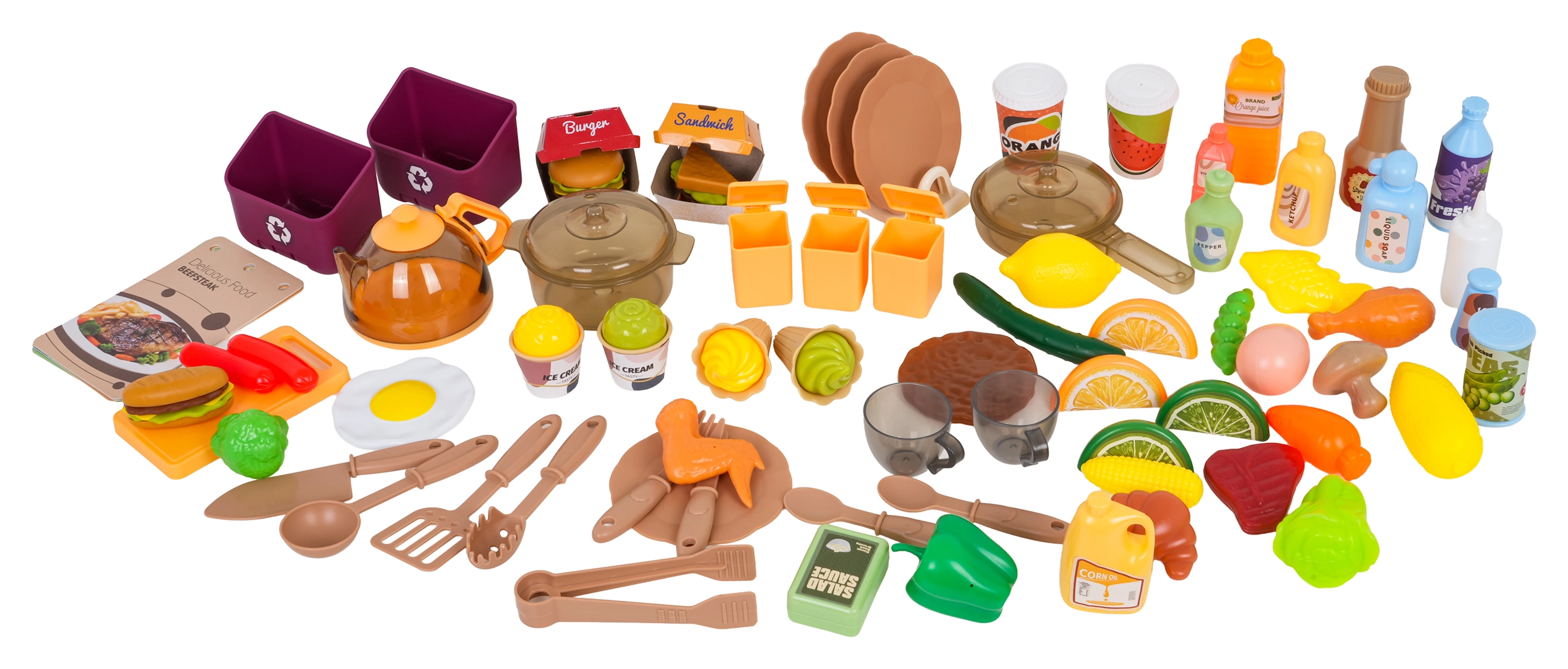 Κατσαρόλες, τηγάνι, τσαγερό, σερβίτσια, μαχαιροπίρουνα, βαζάκια μπαχαρικών, τρόφιμα, κάρτες μενού και κάδοι σκουπιδιών – όλα όσα χρειάζονται οι μικροί σεφ.