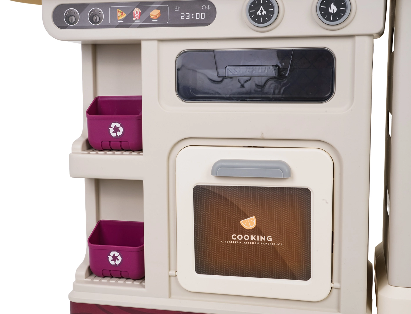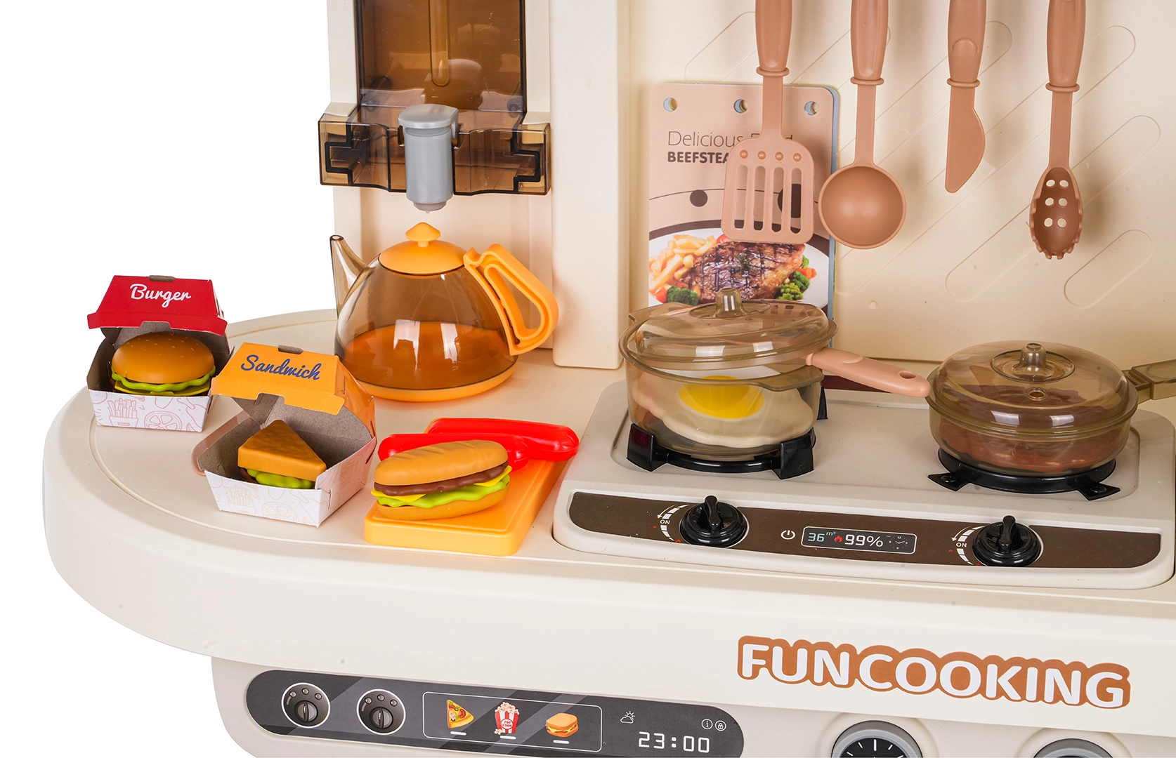 Οι φωτιζόμενες εστίες με ήχους μαγειρέματος και τηγανίσματος συμπληρώνονται από ατμό που βγαίνει από την κατσαρόλα – τα παιδιά βιώνουν αυθεντική ατμόσφαιρα σε κάθε συνταγή.