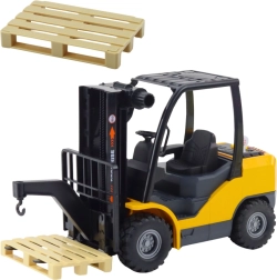 Οι πρακτικές κινητές, ρυθμιζόμενες καθ’ ύψος πιρούνες επιτρέπουν εύκολη ανύψωση και κατέβασμα των φορτίων. Περιλαμβάνεται επίσης παλέτα, ώστε το παιδί να εξασκεί φόρτωση και εκφόρτωση όπως σε πραγματική αποθήκη. Το παιχνίδι αναπτύσσει τη λεπτή κινητικότητα, τον συντονισμό κινήσεων και τη φαντασία.