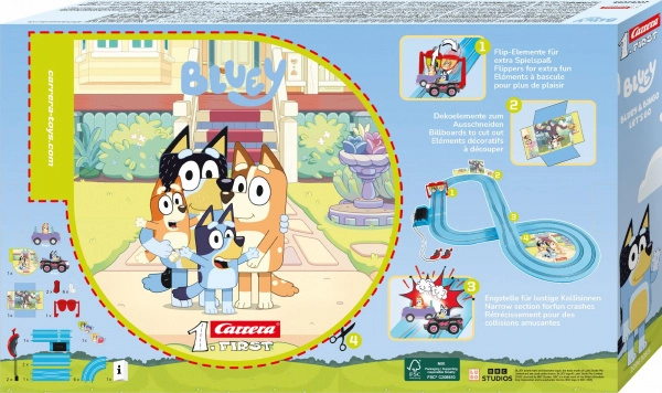 Μπείτε στον κόσμο των αγώνων με την πίστα CARRERA First Bluey – το ιδανικό πρώτο αγωνιστικό σετ για μικρούς οδηγούς. Η πίστα κλίμακας 1:50 προσφέρει δυναμική διαδρομή με ευθείες και στροφές, πύλη εκκίνησης/τερματισμού και πλούσια διακόσμηση με τους αγαπημένους ήρωες BLUEY και BINGO. Χάρη στη λειτουργία με μπαταρίες, το σετ είναι τέλειο για διασκέδαση στο σπίτι και στα ταξίδια.