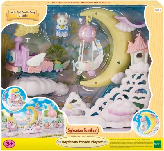 Το σετ Sylvanian Families Παρέλαση στα σύννεφα προσφέρει στα παιδιά έναν ποιητικό κόσμο γεμάτο όνειρα. Η ιπτάμενη ατμομηχανή τραβά μια πλατφόρμα με μεγάλο φεγγάρι και προσαρτημένο αεροπλανάκι-μπαλόνι, το οποίο λικνίζεται απαλά κατά την κίνηση. Περιλαμβάνεται η χαριτωμένη φιγούρα του γατιού Latte με κοστούμι πεφταστεριού, έτοιμη για μαγικές πτήσεις.