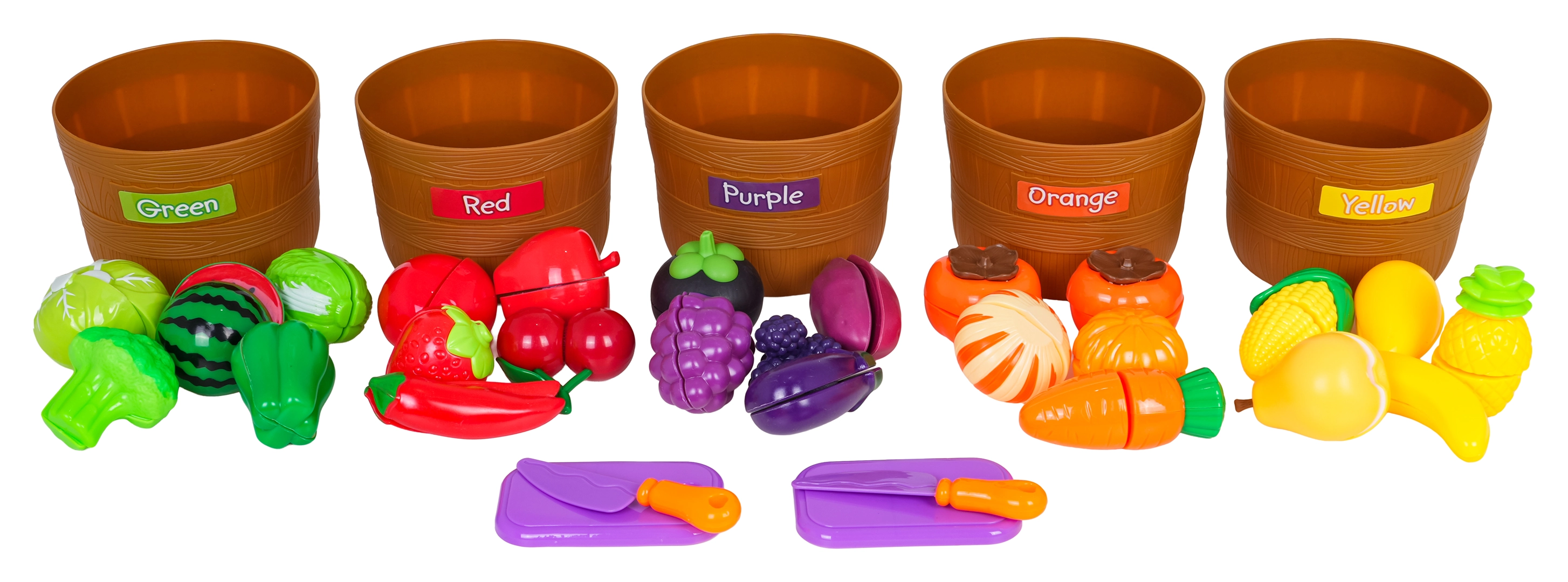 Πέντε σημειωμένα καλαθάκια (πράσινο, κόκκινο, μωβ, πορτοκαλί, κίτρινο) βοηθούν τα παιδιά να ταξινομούν εύκολα φρούτα και λαχανικά κατά χρώμα και αναπτύσσουν τη λογική σκέψη.