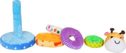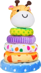 Η χαριτωμένη μαλακή πυραμίδα σε σχήμα καμηλοπάρδαλης αναπτύσσει τη λεπτή κινητικότητα, τον συντονισμό χεριού–ματιού και τη διαλογή κατά μέγεθος. Τα χρωματιστά, μαλακά δαχτυλίδια από βελούδινο ύφασμα προσκαλούν στην αφή και στο ασφαλές παιχνίδι. Στο κεφάλι της καμηλοπάρδαλης κρύβεται μια σφυρίχτρα, που με το πάτημα παράγει ήχο και ενισχύει την αισθητηριακή αντίληψη. Ιδανικό παιχνίδι για παιδιά από 18 μηνών.