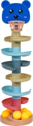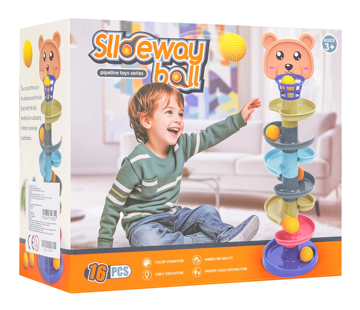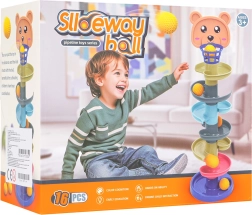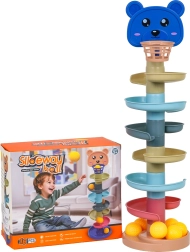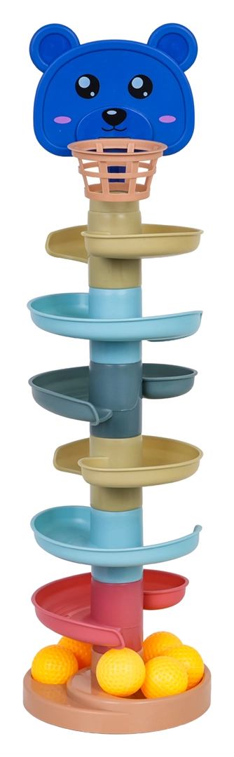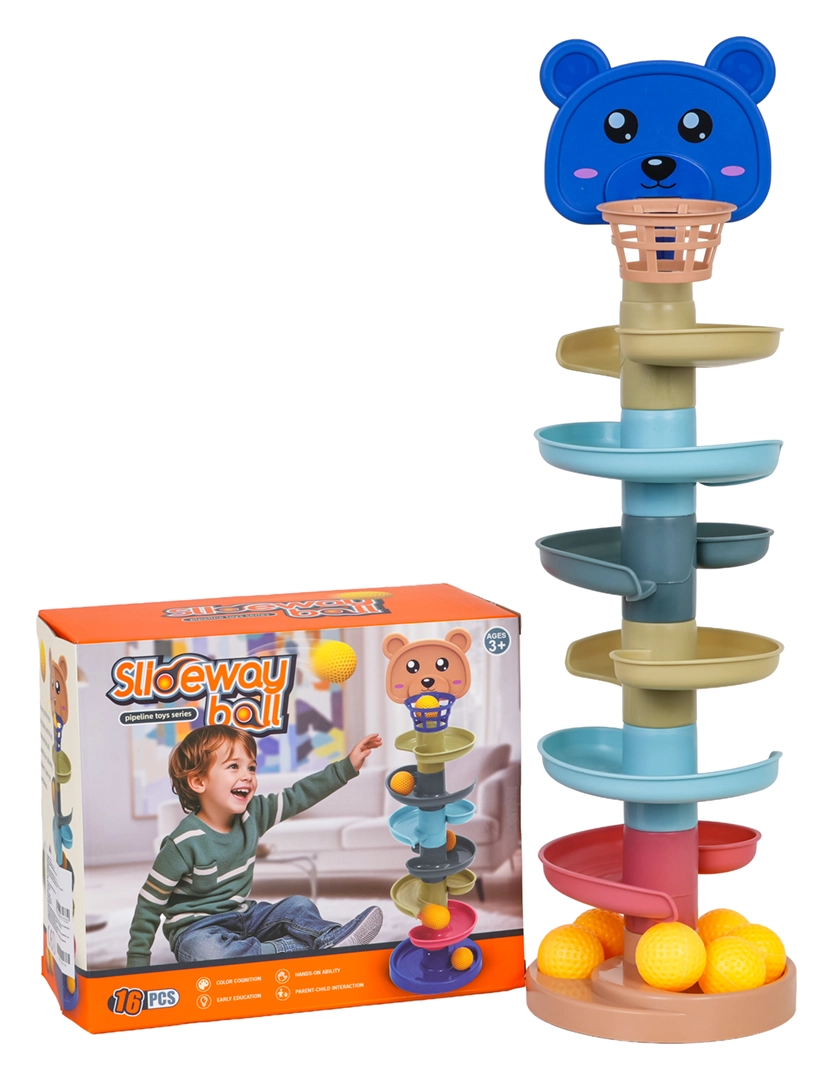 Αυτή η χρωματιστή μπίλια-πίστα με κεφαλάκι αρκούδας και επάνω καλαθάκι θα ξετρελάνει τους μικρούς «μηχανικούς» και τα περίεργα χεράκια. Τα κομμάτια κουμπώνουν εύκολα, στήνετε πύργο έως και 6 επιπέδων και παρακολουθείτε τις μπαλίτσες να στροβιλίζονται στις σπείρες μέχρι τη βάση. Όσο ψηλότερο τον φτιάχνετε, τόσο μεγαλύτερη η πρόκληση να πετύχετε το καλαθάκι – υπέροχο παιχνίδι για ανάπτυξη υπομονής και συγκέντρωσης.