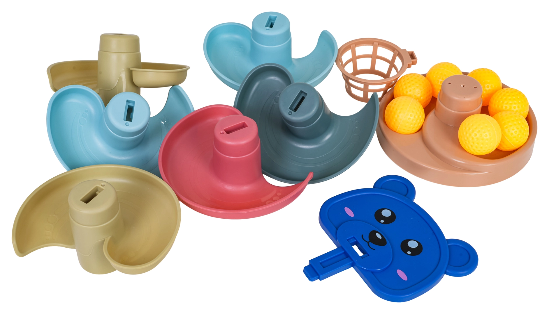 Το σετ περιλαμβάνει 16 κομμάτια: σταθερή βάση, 6 επίπεδα, κεφαλάκι αρκούδας με καλαθάκι και 7 ελαφριές, υφές μπαλίτσες που είναι ευχάριστες στο παιδικό χέρι. Ο αρθρωτός σχεδιασμός επιτρέπει να προσαρμόζετε ελεύθερα την πίστα ανάλογα με την ηλικία και τις δεξιότητες του παιδιού.
