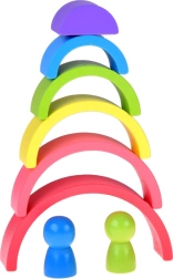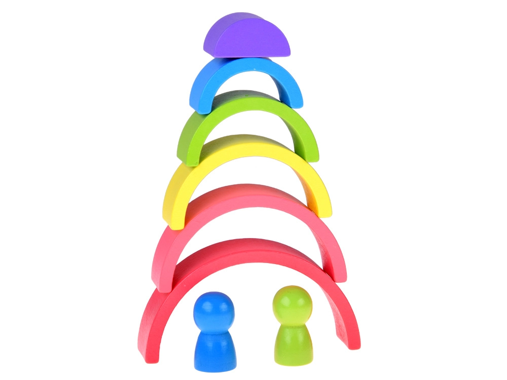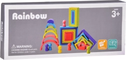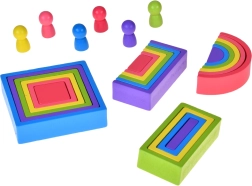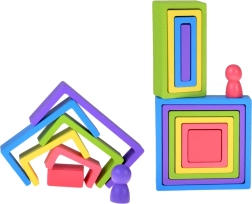 Αυτό το πολύχρωμο ξύλινο σετ προσφέρει ανοιχτό παιχνίδι εμπνευσμένο από τη μέθοδο Montessori. Τα παιδιά μπορούν να κατασκευάσουν πύργους, γέφυρες, σπιτάκια και αφηρημένες δομές, να ταξινομήσουν τα κομμάτια κατά μέγεθος και χρώμα, ή να τα τοποθετούν το ένα μέσα στο άλλο και να τα στοιβάζουν. Το παιχνίδι αναπτύσσει τη δημιουργικότητα, την χωρική αντίληψη και τη λογική σκέψη.