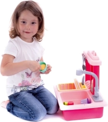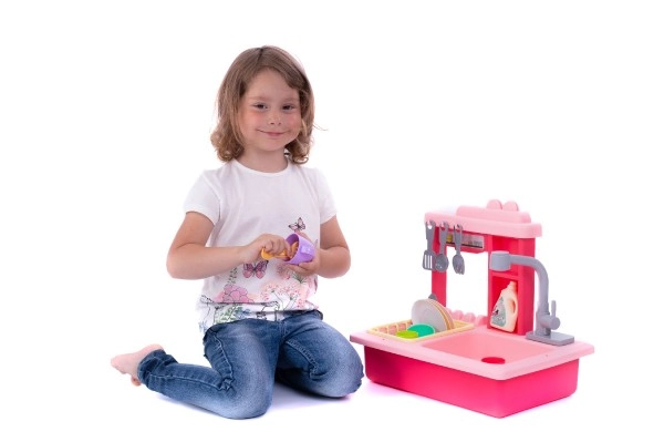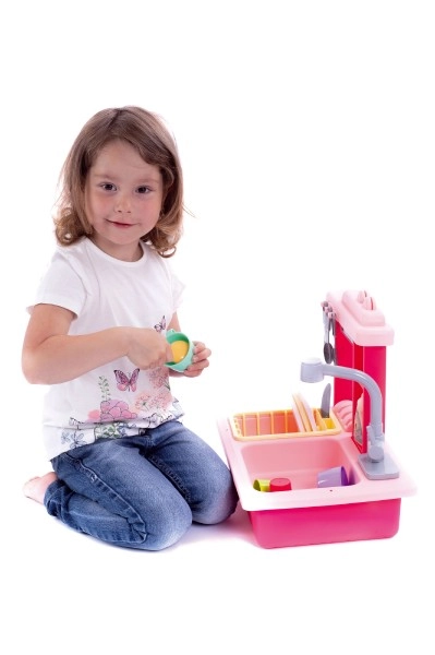 Απολαύστε διασκεδαστικό πλύσιμο πιάτων με αυτόν τον παιδικό νεροχύτη σε ροζ χρώμα, που περιλαμβάνει λειτουργική βρύση, δεξαμενή νερού και αποσπώμενο στράγγιστρο.