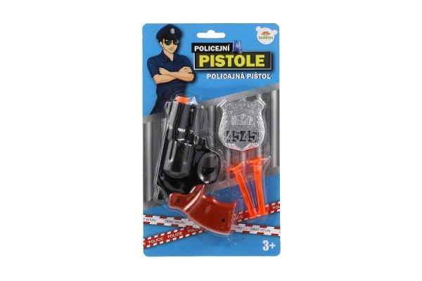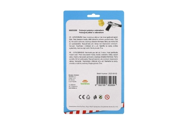 - Περιεχόμενο συσκευασίας: πλαστικό πιστόλι (περίπου 15 εκ.), 2× βέλος με βεντούζα, αστυνομικό σήμα