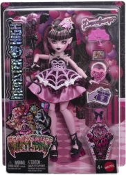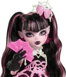 Η Draculaura προσκαλεί στο πιο τρομακτικά γλυκό πάρτι του αιώνα! Η εμβληματική monster έρχεται με υπέροχο γκοθ σύνολο σε ροζ και μαύρο, συμπληρωμένο με θεματικά αξεσουάρ – από μπαλόνι σε σχήμα καρδιάς με φτερά νυχτερίδας μέχρι στιλάτη τσάντα και χτενάκι. Χάρη στην αρθρωτή κατασκευή, η κούκλα ποζάρει και εκτίθεται εύκολα.