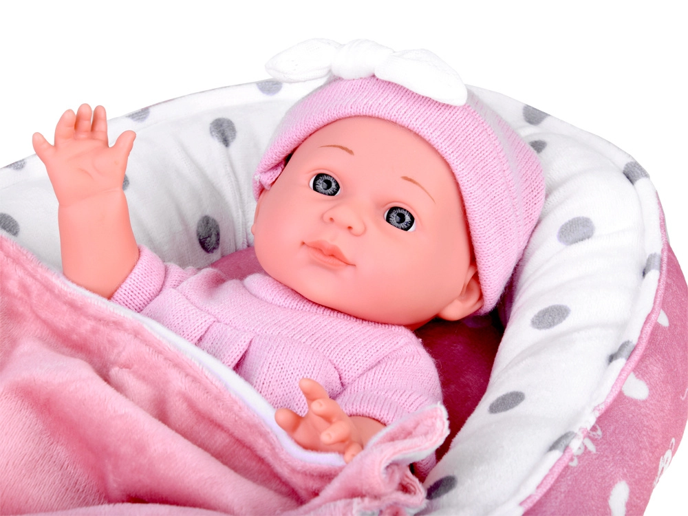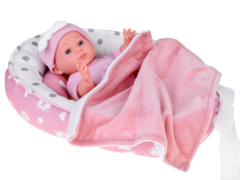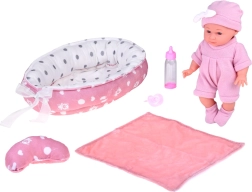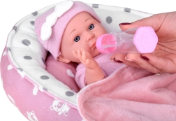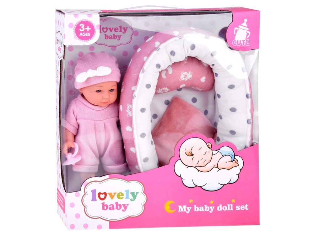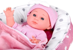 Χαριτωμένο μωρό σε ροζ ρουχαλάκια με απαλή φωλίτσα, μαξιλαράκι και κουβερτάκι, που προσφέρει στα παιδιά ρεαλιστικό παιχνίδι φροντίδας. Περιλαμβάνονται επίσης μπιμπερό και πιπίλα, η κούκλα έχει κινητά άκρα και εύκολα αποσπώμενα ρουχαλάκια σε απαλές παστέλ αποχρώσεις.