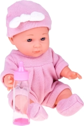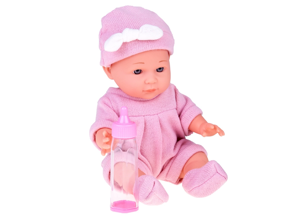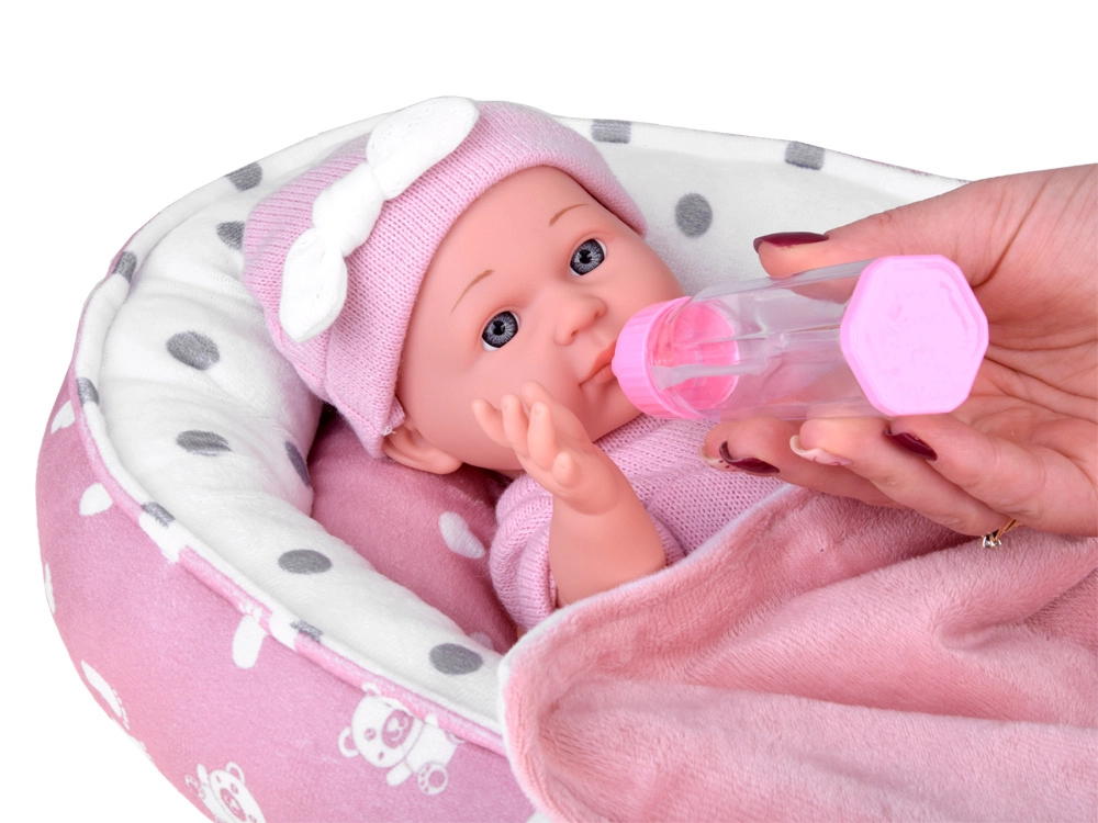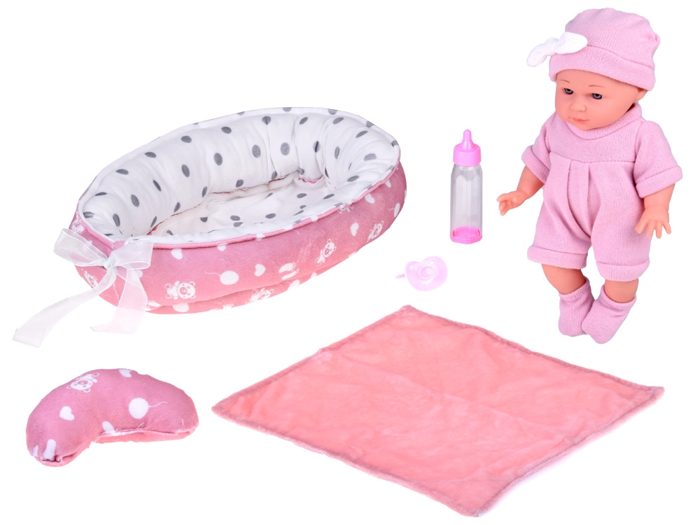 - Κούκλα με ροζ ρουχαλάκια και σκουφάκι, υφασμάτινη φωλίτσα με μαξιλαράκι και κουβερτάκι, μπιμπερό, πιπίλα