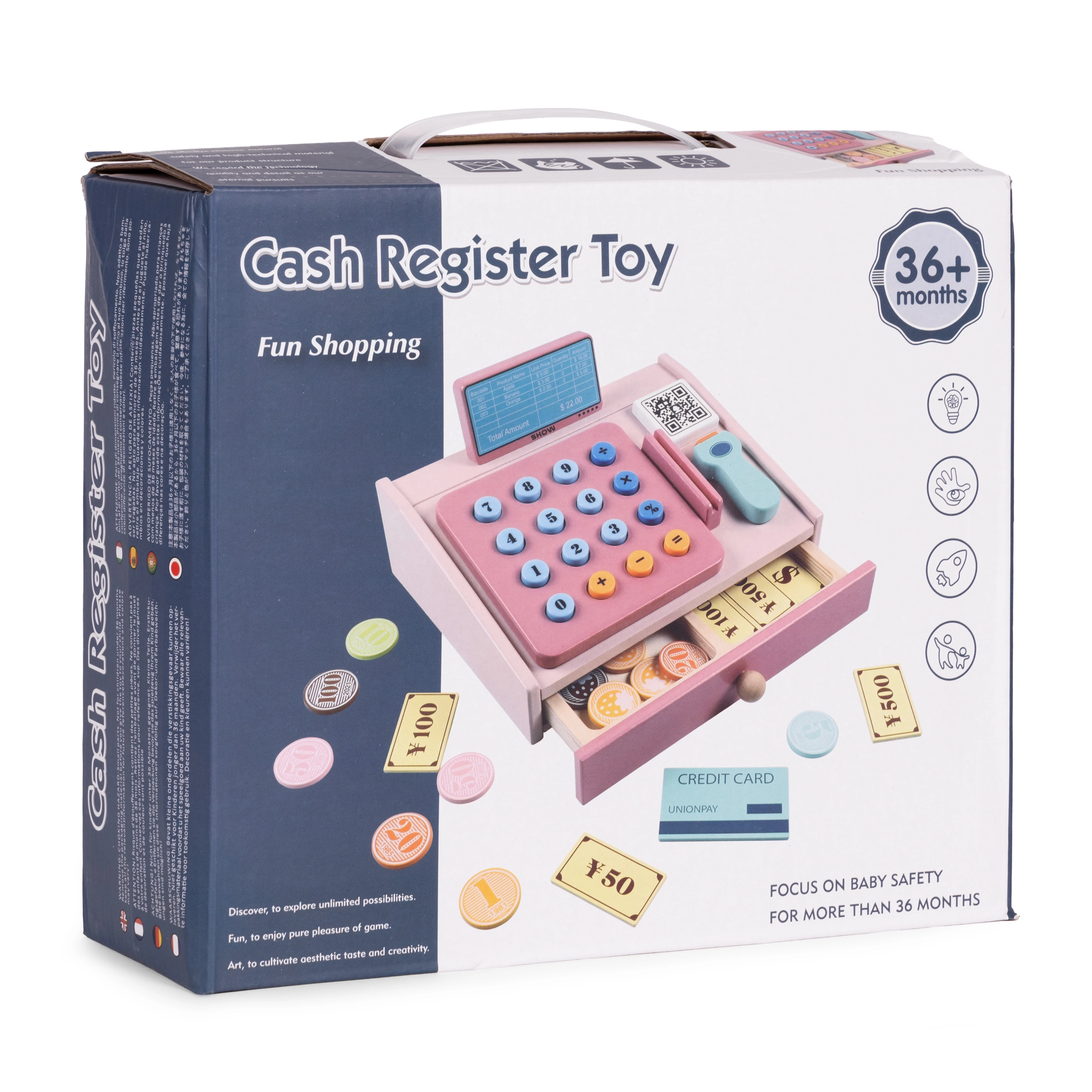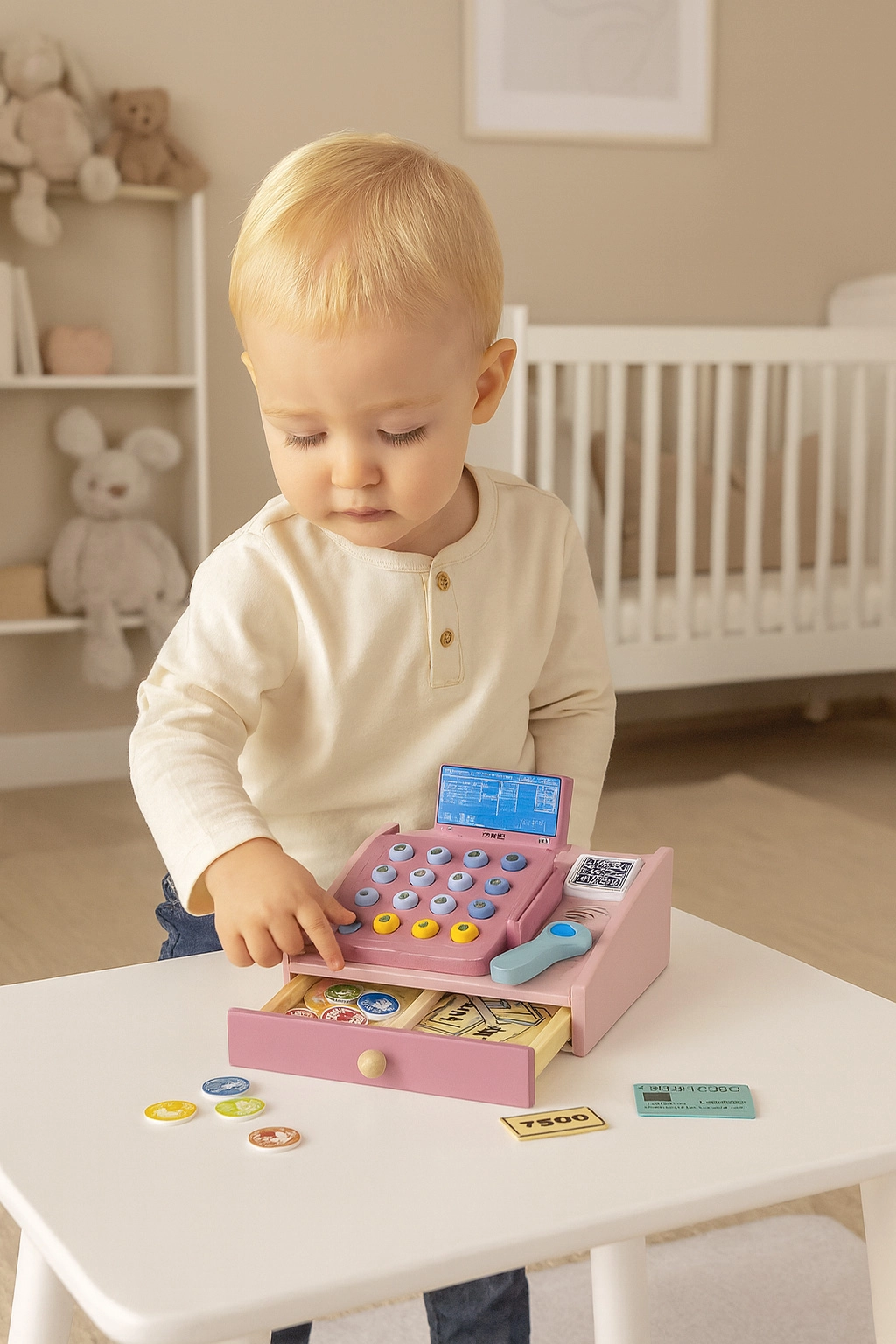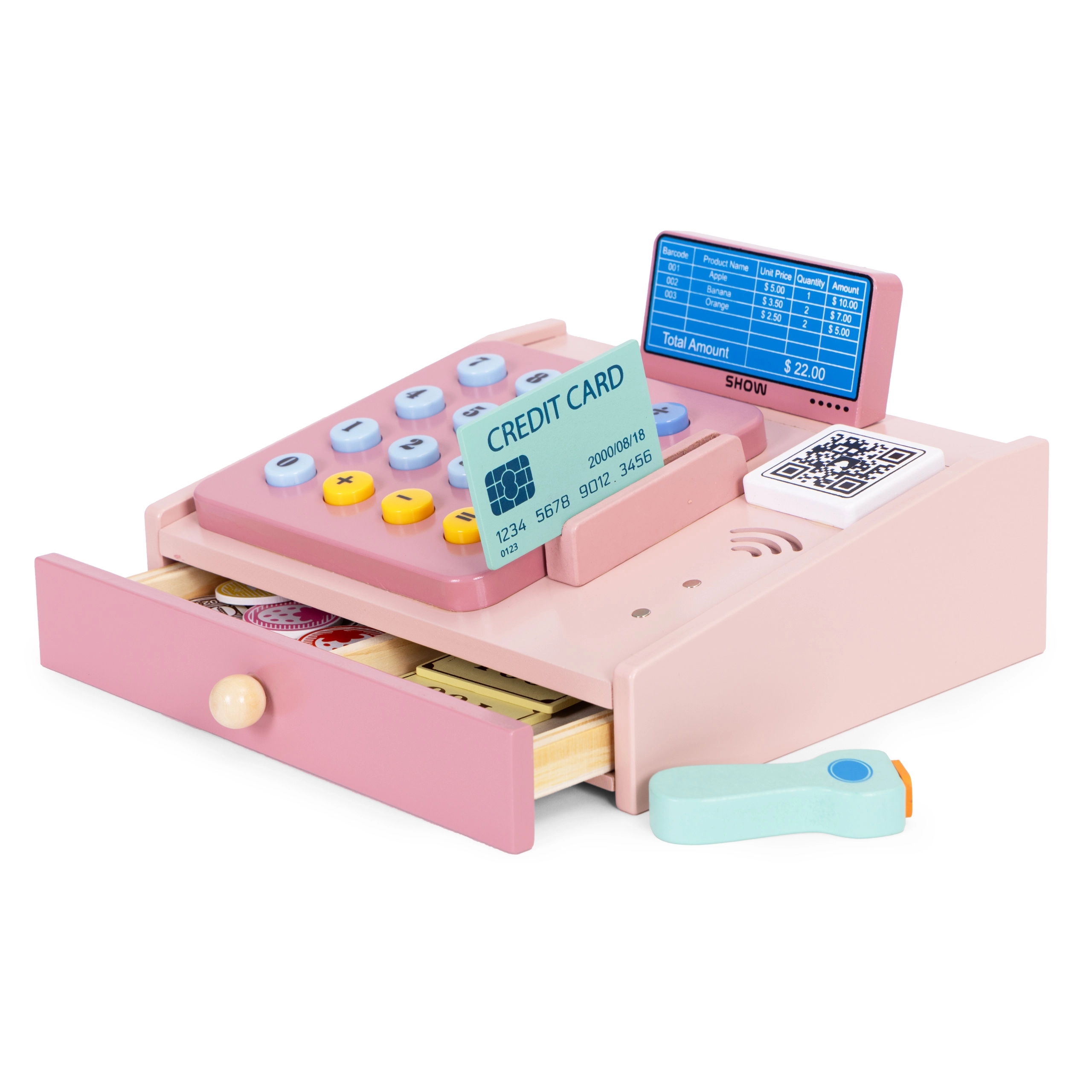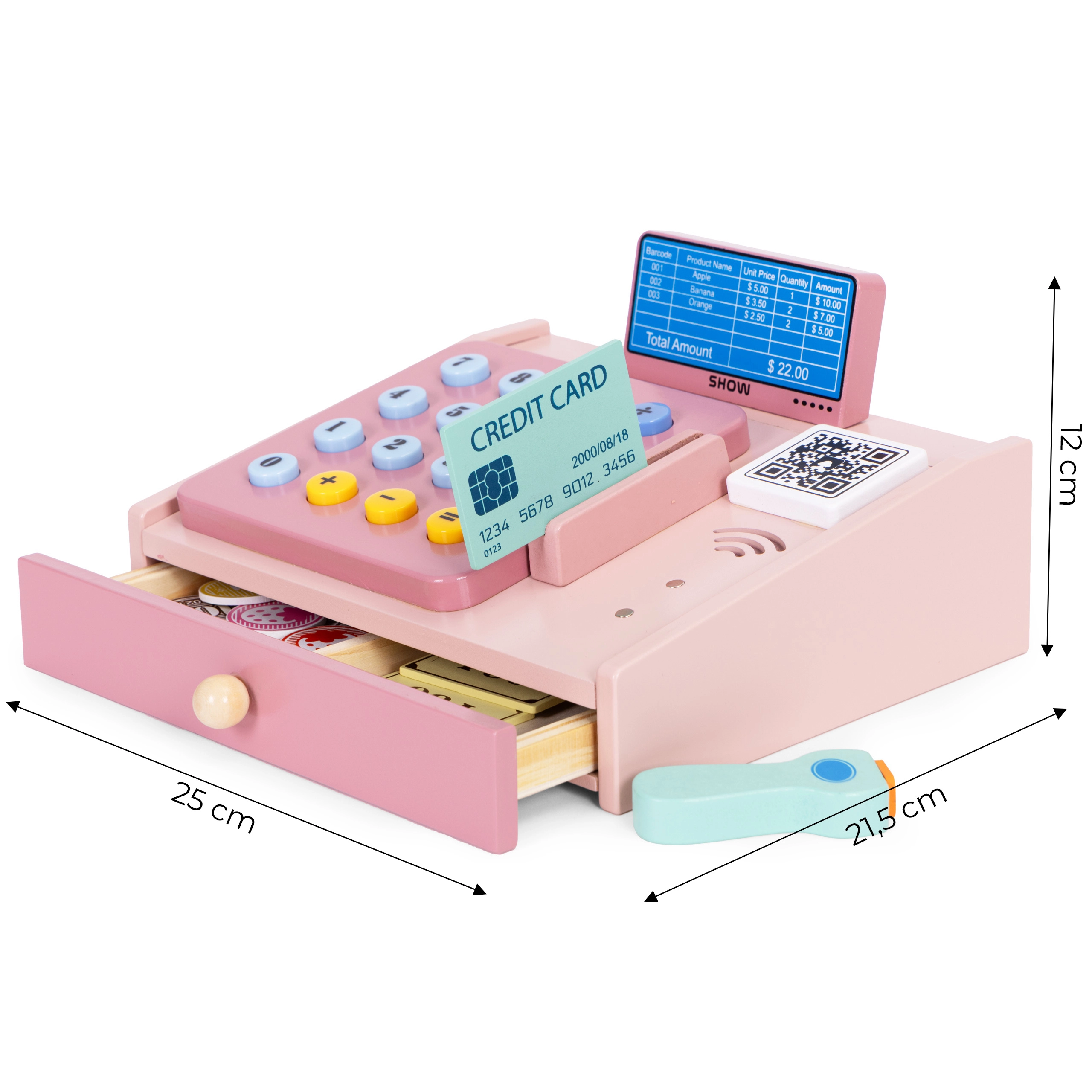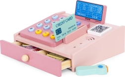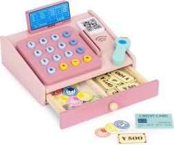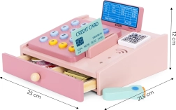 Αυτό το ποιοτικό ξύλινο ταμείο σε απαλές παστέλ αποχρώσεις είναι ιδανικό συμπλήρωμα για τη γωνιά παιχνιδιού ή το παιδικό δωμάτιο. Οι ρεαλιστικές λεπτομέρειες όπως το χειροκίνητο σκάνερ, το τερματικό πληρωμών, το πληκτρολόγιο με κουμπιά και ο συρόμενος δίσκος κάνουν το παιχνίδι καταστήματος διασκεδαστικό και εκπαιδευτικό. Τα παιδιά εξασκούν βασικά μαθηματικά, λογική σκέψη και επικοινωνία.