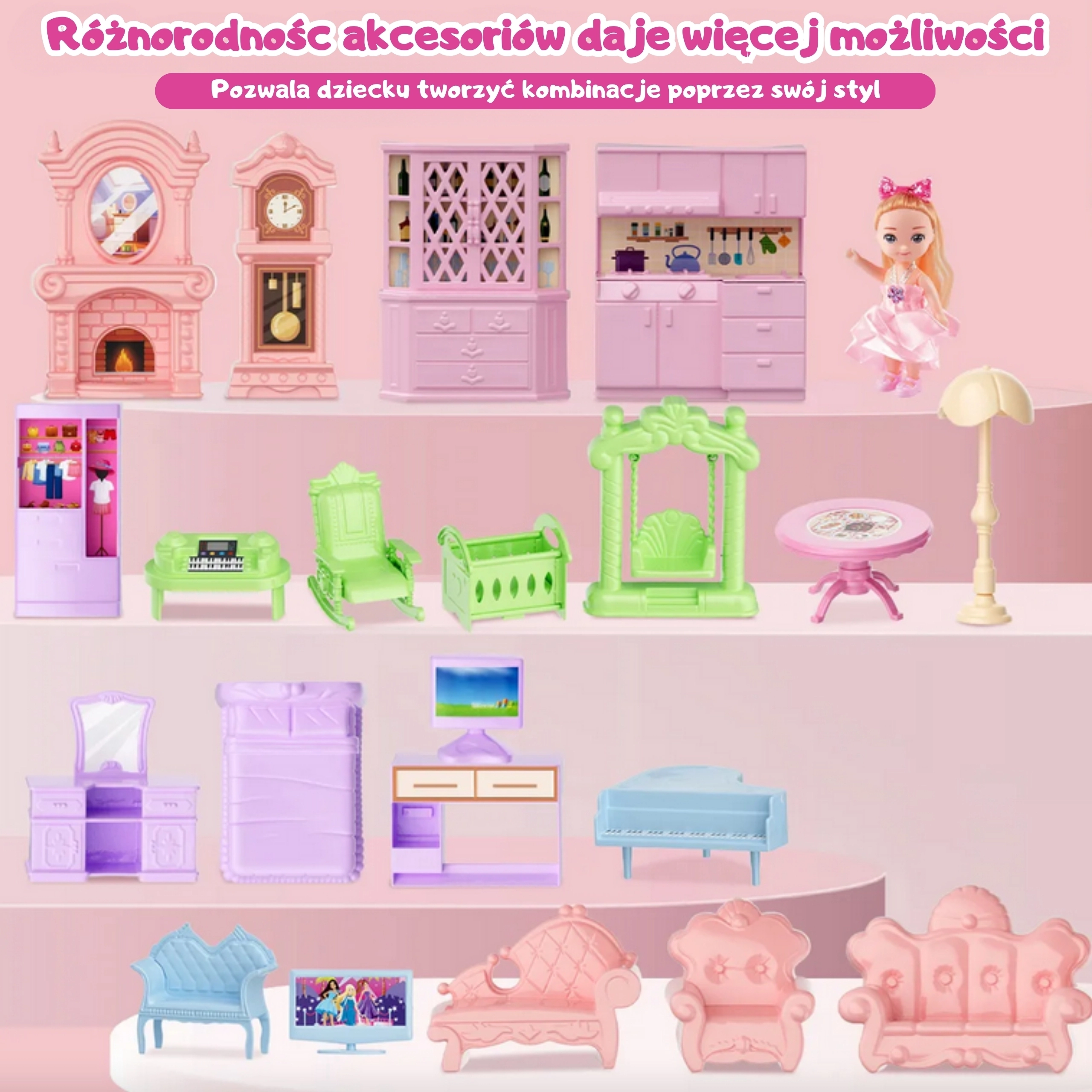 Περιλαμβάνεται πλούσιο σετ αξεσουάρ – έπιπλα, διακοσμήσεις και φιγούρες, ώστε τα παιδιά να μπορούν να αναδιαμορφώνουν ελεύθερα το εσωτερικό και να σχεδιάζουν. Ασφαλή υλικά, στρογγυλεμένες άκρες και ποιοτική κατασκευή εξασφαλίζουν ξέγνοιαστο παιχνίδι από 3 ετών.