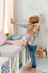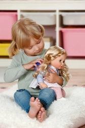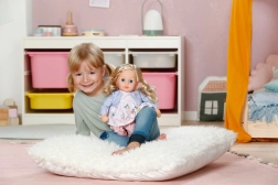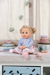 Στη συσκευασία περιλαμβάνεται πλήρες σετ ρούχων: απαλό φόρεμα με ελαφριά ζακέτα, άνετα κολάν και παπούτσια. Χάρη στα κινητά άκρα της, η κούκλα κάθεται και ντύνεται εύκολα. Το παιχνίδι με την κούκλα αναπτύσσει τη λεπτή κινητικότητα, την ενσυναίσθηση και τη φαντασία – ιδανική επιλογή ως πρώτη κούκλα για τους μικρούς.