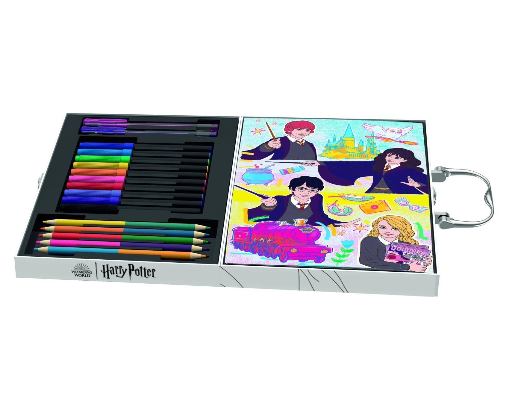 Ανακαλύψτε τον μαγικό κόσμο της δημιουργίας με τη δημιουργική βαλίτσα Harry Potter. Ένα compact σετ σε φορητή βαλίτσα που περιλαμβάνει μαρκαδόρους, δίχρωμα μολύβια ζωγραφικής, τζελ στυλό και τζελ μαρκαδόρους, τετράδιο για σκίτσα και αυτοκόλλητα. Η εξωτερική πλευρά της βαλίτσας μπορεί να χρωματιστεί, ώστε τα παιδιά να δημιουργήσουν το δικό τους μοναδικό σχέδιο. Ιδανική για ταξίδια, δημιουργία στο σπίτι και ως δώρο για μικρούς θαυμαστές του κόσμου της μαγείας. Κατάλληλη για παιδιά από 3 ετών.