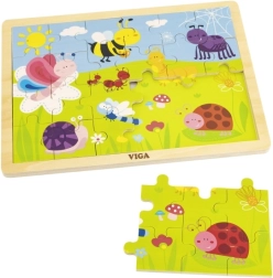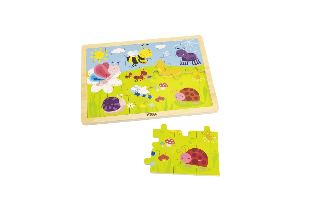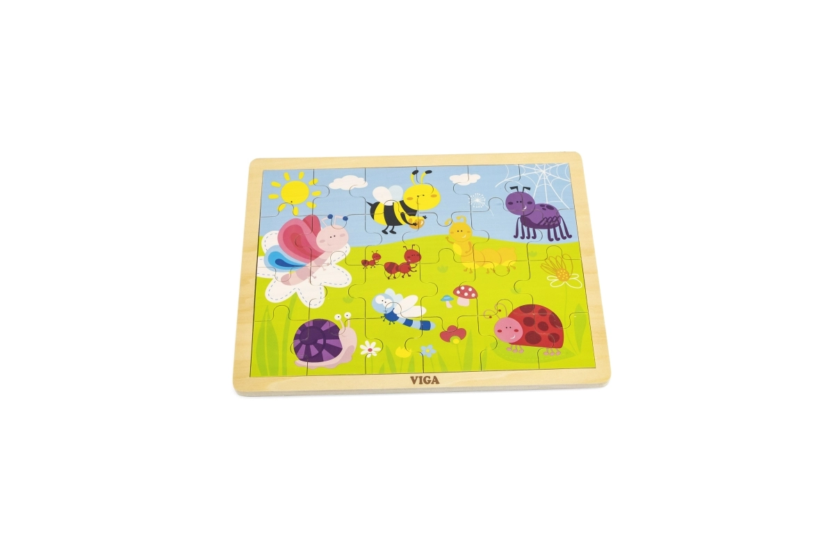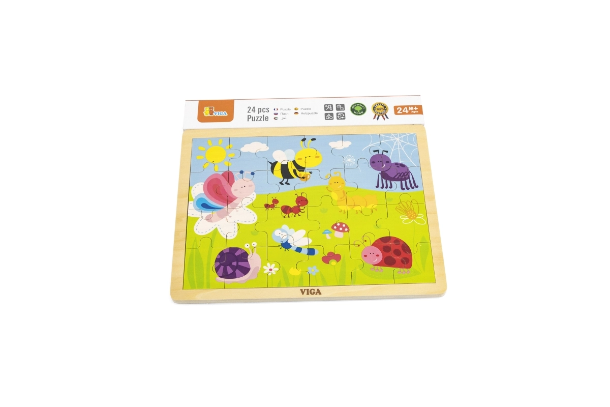 Ανακαλύψτε το ποιοτικό ξύλινο παζλ VIGA με εικονογράφηση ενός λιβαδιού γεμάτου πολύχρωμα εντομάκια – μέλισσα, πεταλούδα, πασχαλίτσα και σαλιγκάρι. Η συναρμολόγηση 24 ανθεκτικών κομματιών μέσα σε πλαίσιο καλλιεργεί την υπομονή και τη συγκέντρωση, ενώ τα παιδιά αναγνωρίζουν σχήματα, χρώματα και λεπτομέρειες της φιλικής εικονογράφησης.