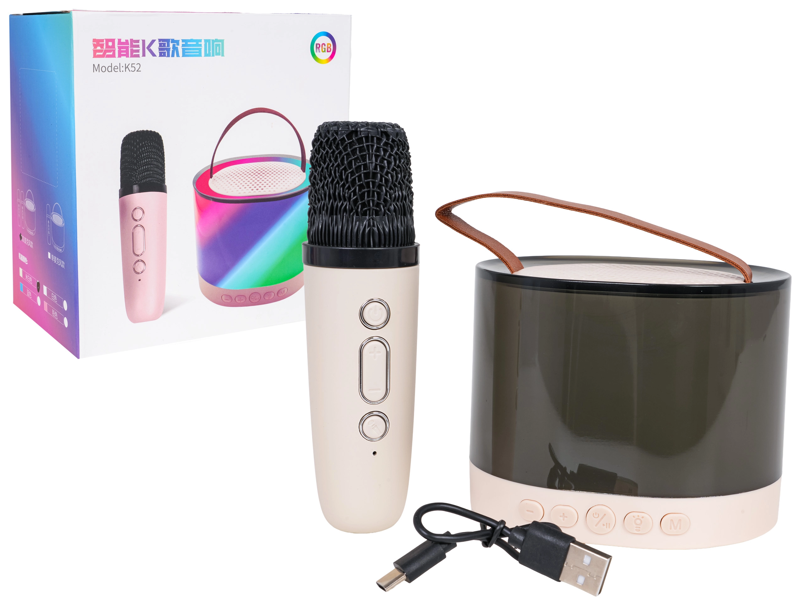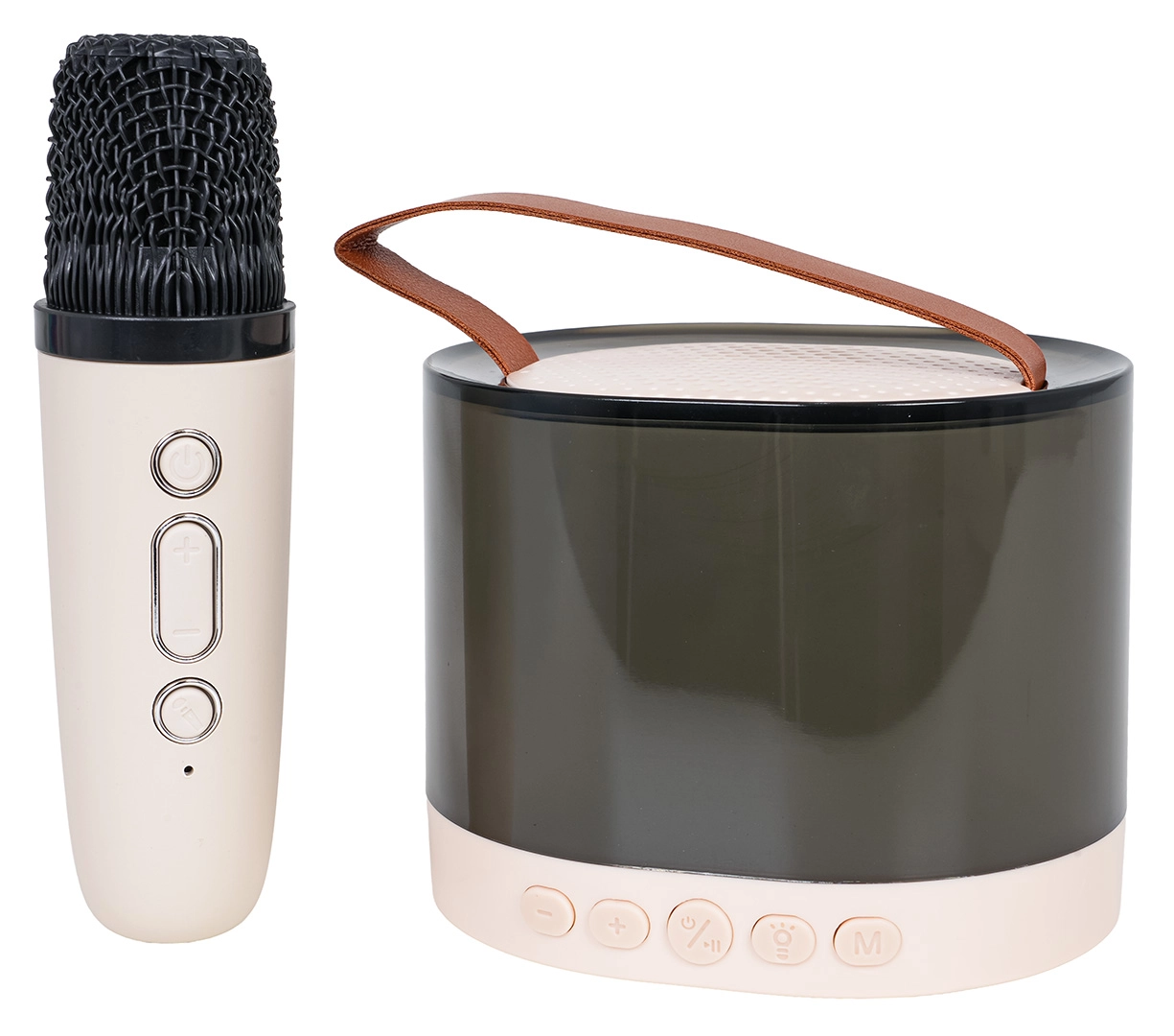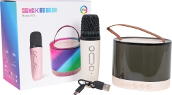 Αυτό το φορητό σετ καραόκε συνδυάζει ποιοτικό ασύρματο μικρόφωνο και κομψό ηχείο με ημιδιαφανές σώμα και δερματίνη λαβή για εύκολη μεταφορά. Η προηγμένη αποκωδικοποίηση MP3 και η μείωση θορύβου DSP εξασφαλίζουν έντονα μπάσα, καθαρά πρίμα και δυνατό, γεμάτο ήχο. Ο φωτισμός RGB LED προσφέρει 5 εφέ που συγχρονίζονται με τη μουσική – με σύντομο πάτημα αλλάζετε λειτουργίες, με παρατεταμένο πάτημα 2 δευτ. σβήνετε τα φώτα.