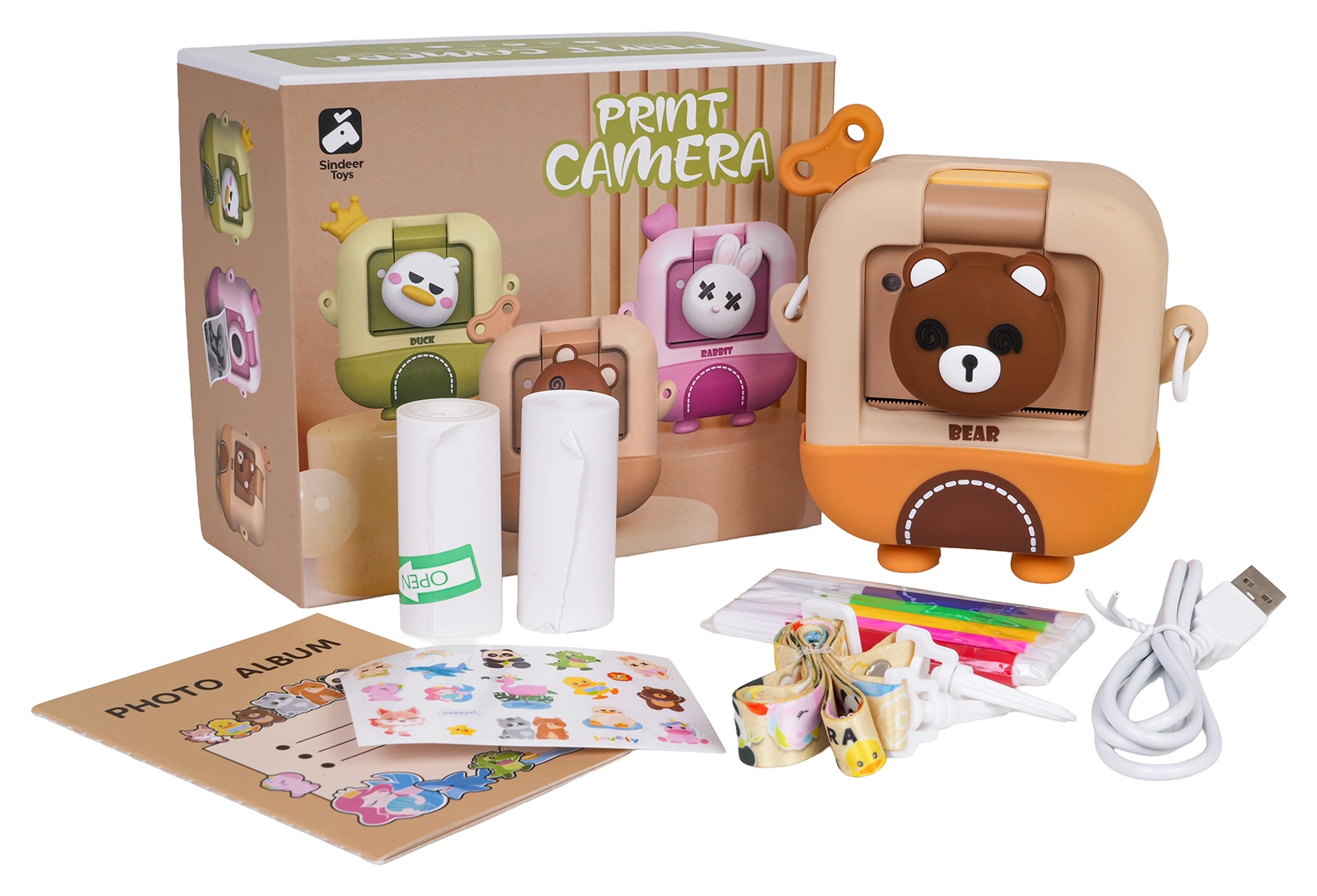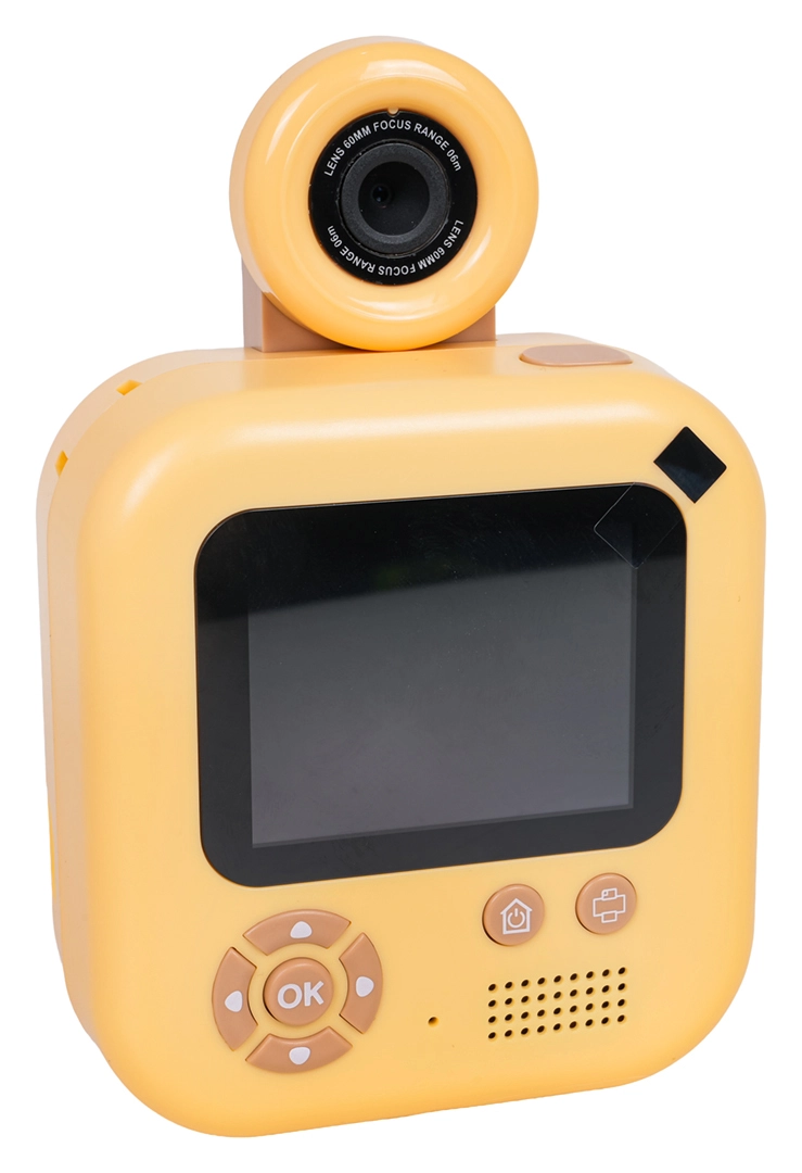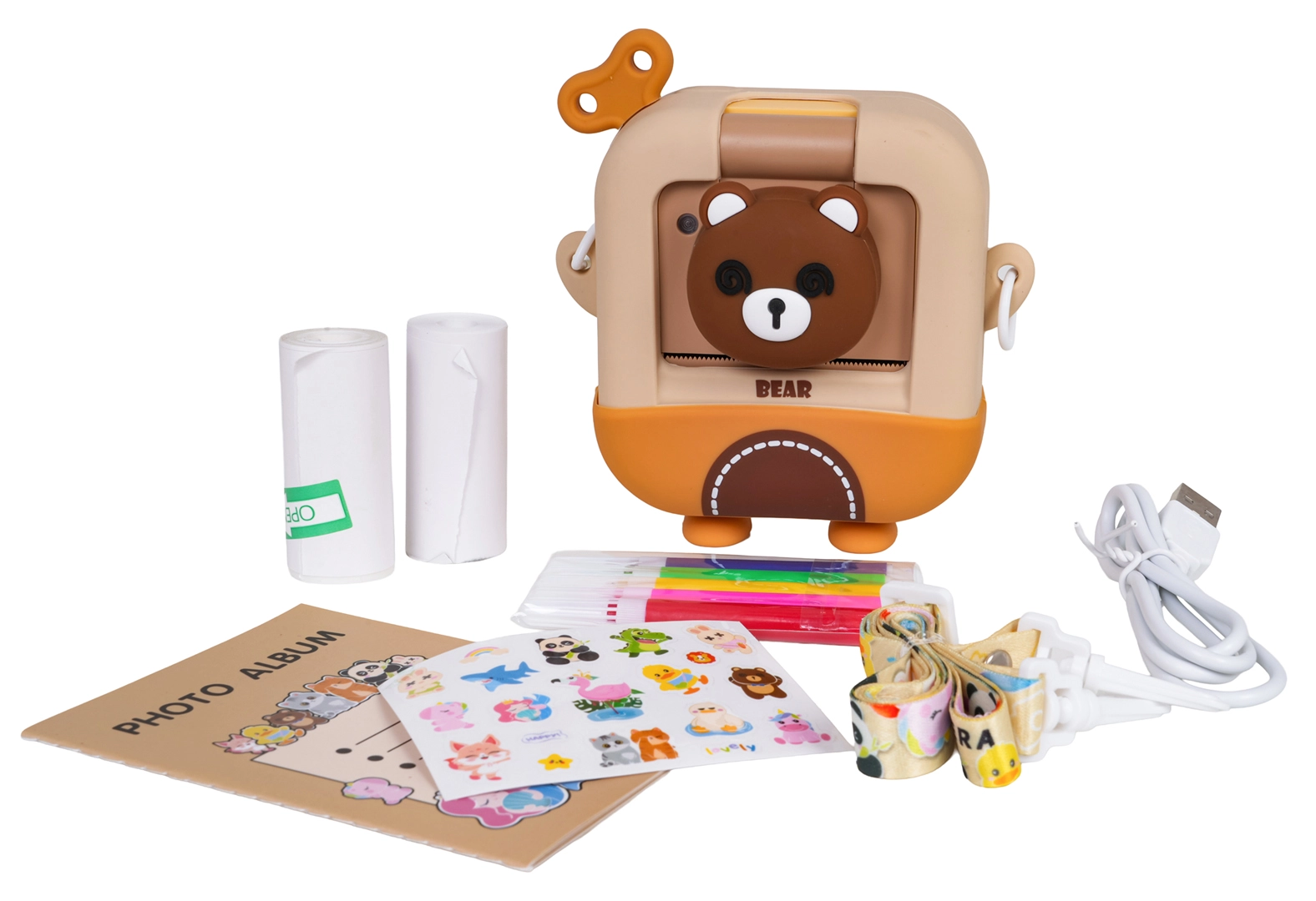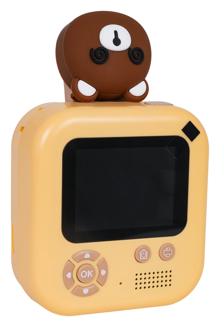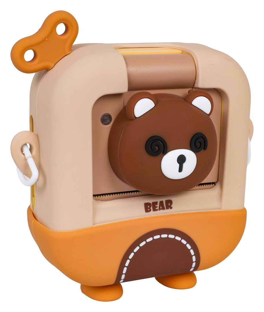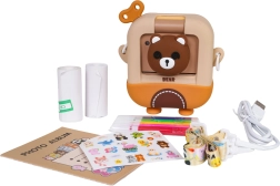 Χαριτωμένη παιδική φωτογραφική μηχανή με σχέδιο αρκουδάκι που μετά τη λήψη μπορεί να εκτυπώνει αμέσως ασπρόμαυρες φωτογραφίες σε θερμικό χαρτί. Περιλαμβάνει πλούσιο σετ αξεσουάρ με 2 ρολά θερμοχαρτιού, χρωματιστούς μαρκαδόρους για να χρωματίζετε τις φωτογραφίες, καλώδιο USB, lanyard, αυτοκόλλητα και μίνι άλμπουμ. Η μηχανή υποστηρίζει εγγραφή βίντεο και διασκεδαστικά εφέ και τροφοδοτείται από τον συμπεριλαμβανόμενο συσσωρευτή 3,7 V – ιδανικό δημιουργικό δώρο για παιδιά από 3 ετών.