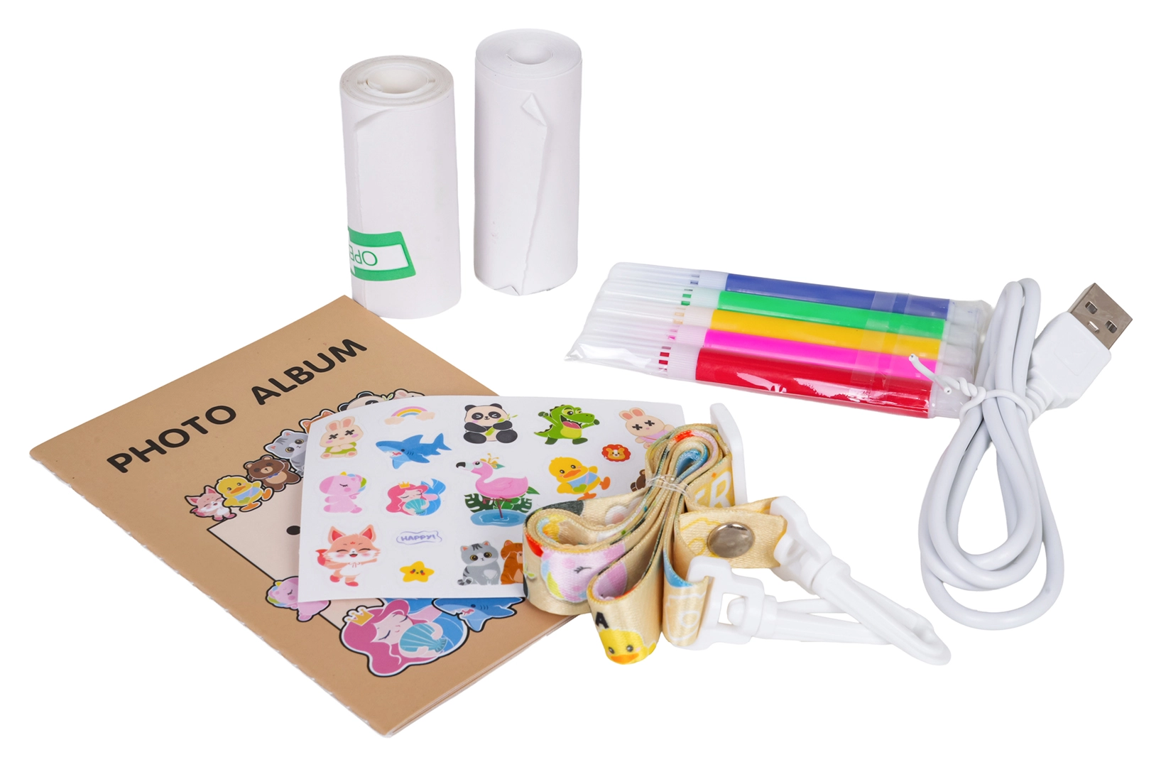 Δύο ρολά χαρτιού, μαρκαδόροι, αυτοκόλλητα, μίνι άλμπουμ, lanyard και καλώδιο USB – ό,τι χρειάζονται τα παιδιά για να δημιουργήσουν τις δικές τους φωτο-ιστορίες.