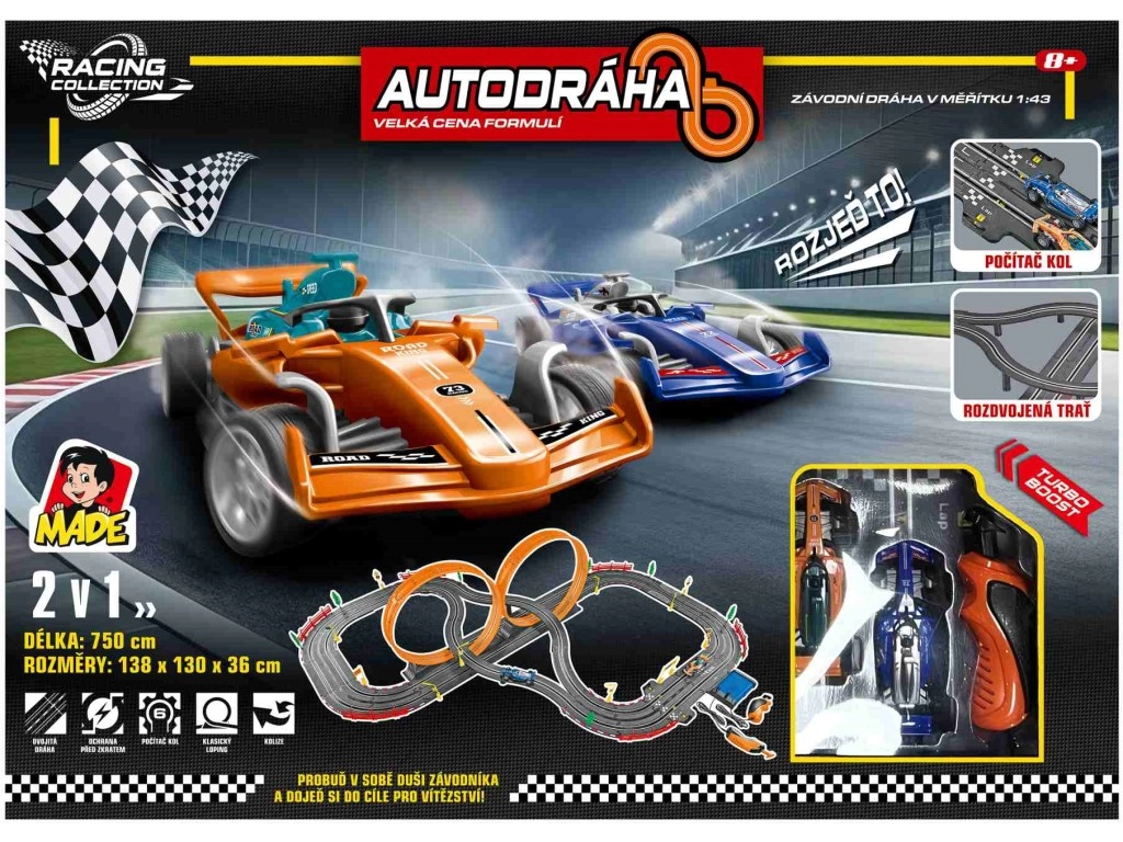 Αυτή η πίστα με φόρμουλες μετατρέπει το σαλόνι σε αγωνιστική διαδρομή. Χάρη στη στιβαρή κατασκευή και τον μελετημένο σχεδιασμό προσφέρει δυναμικούς αγώνες, εύκολο χειρισμό και άμεση ετοιμότητα για οδήγηση χάρη στο παρεχόμενο τροφοδοτικό 12 V. Οι διαστάσεις της συναρμολογημένης πίστας 138 × 130 × 36 cm προσφέρουν άφθονο χώρο για εντυπωσιακά περάσματα.