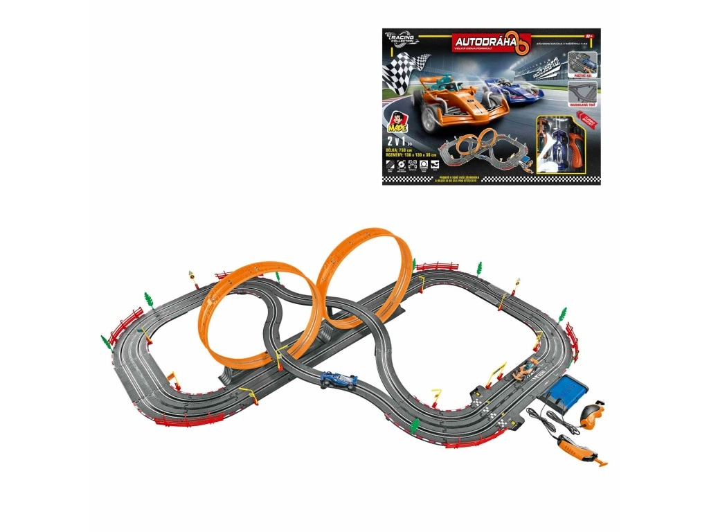 Απολαύστε αγώνες στο σπίτι με πίστα αυτοκινήτων με φόρμουλες μήκους 7,5 μέτρων. Σταθερή πίστα από ποιοτικό πλαστικό, απλός χειρισμός και τροφοδοτικό 12 V στη συσκευασία που εξασφαλίζουν γρήγορη οδήγηση και άφθονη διασκέδαση για παιδιά από 3 ετών.