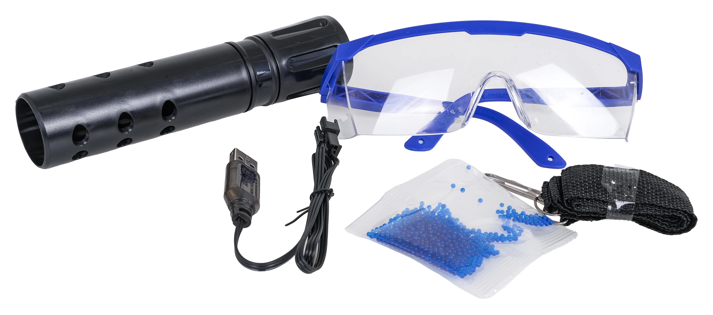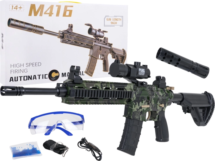 - Blaster M416, γεμιστήρας, σιγαστήρας, σκοπευτικό, καλώδιο USB, μπαταρία 7,4 V, σακουλάκι με περίπου 500 υδρογέλες για προετοιμασία, ιμάντας, προστατευτικά γυαλιά, οδηγίες
