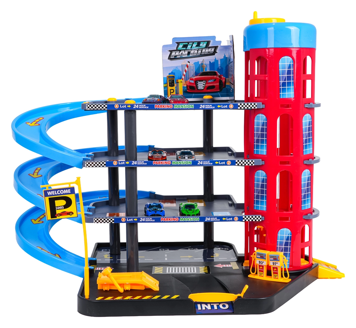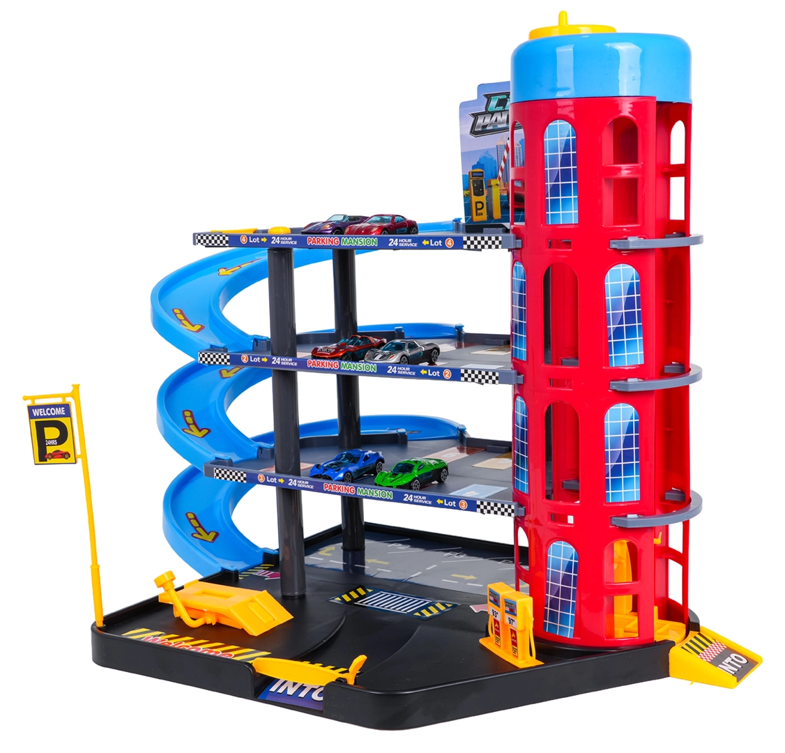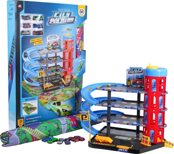 Διασκεδαστικό πολυώροφο πάρκινγκ για παιδιά από 3 ετών με χειροκίνητο ασανσέρ, σπειροειδείς κατηφόρες, βενζινάδικο και ανυψωτήρα συνεργείου. Περιλαμβάνει μεγάλο τσοχένιο τάπητα παιχνιδιού με δρόμους και 6 μεταλλικά αυτοκινητάκια για ώρες δημιουργικού παιχνιδιού και αγώνων.