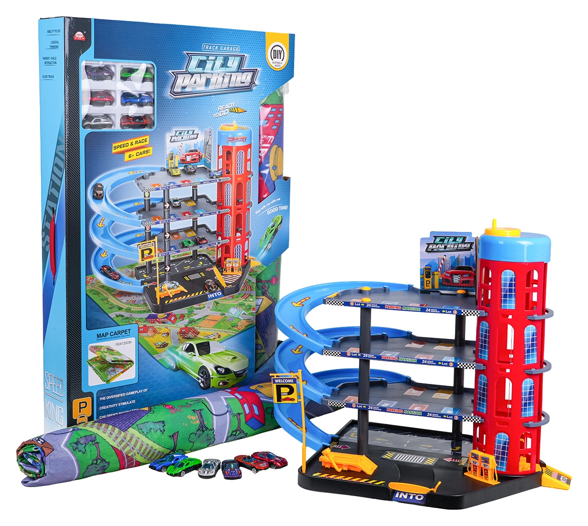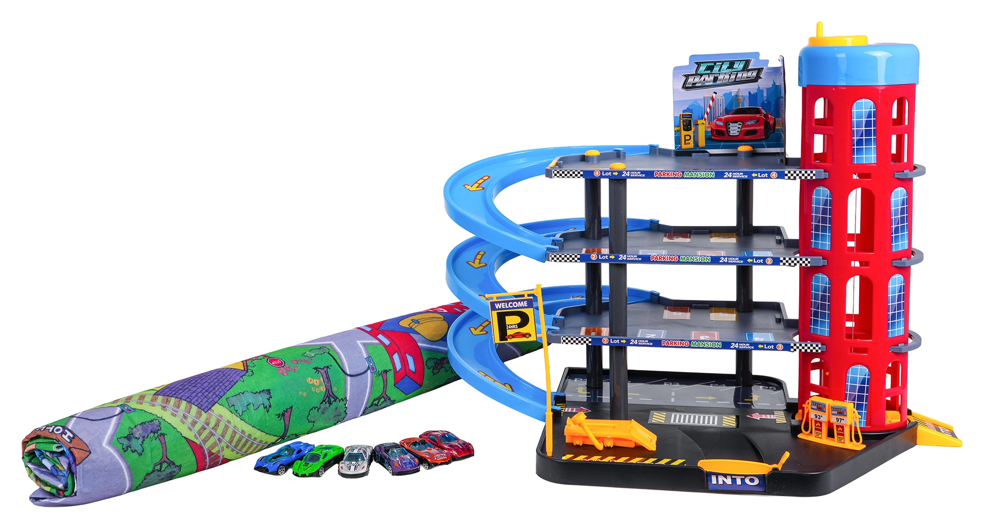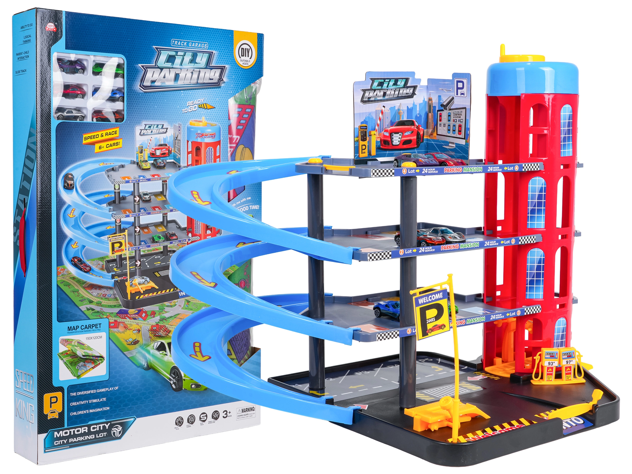 Διασκεδαστικό πολυώροφο πάρκινγκ για παιδιά από 3 ετών με χειροκίνητο ασανσέρ, σπειροειδείς κατηφόρες, βενζινάδικο και ανυψωτήρα συνεργείου. Περιλαμβάνει μεγάλο τσοχένιο τάπητα παιχνιδιού με δρόμους και 6 μεταλλικά αυτοκινητάκια για ώρες δημιουργικού παιχνιδιού και αγώνων.