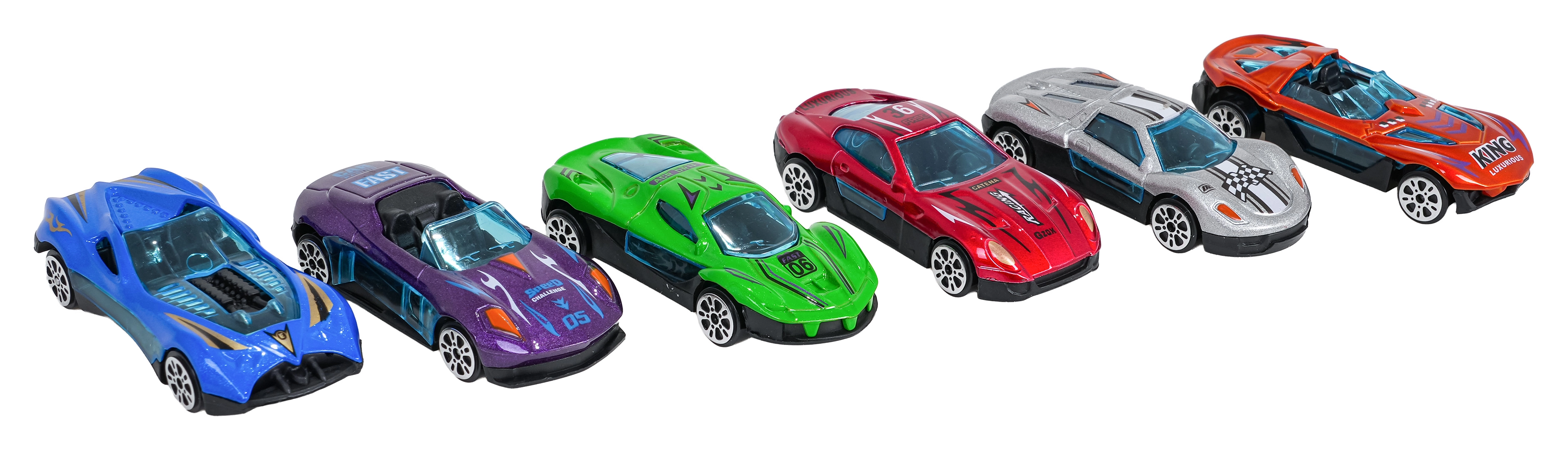 Έτοιμο για παιχνίδι αμέσως: έξι ανθεκτικά αυτοκίνητα με μεταλλικό αμάξωμα, ομαλή κύλιση τροχών και σπορ γραφικά για ατελείωτους αγώνες.