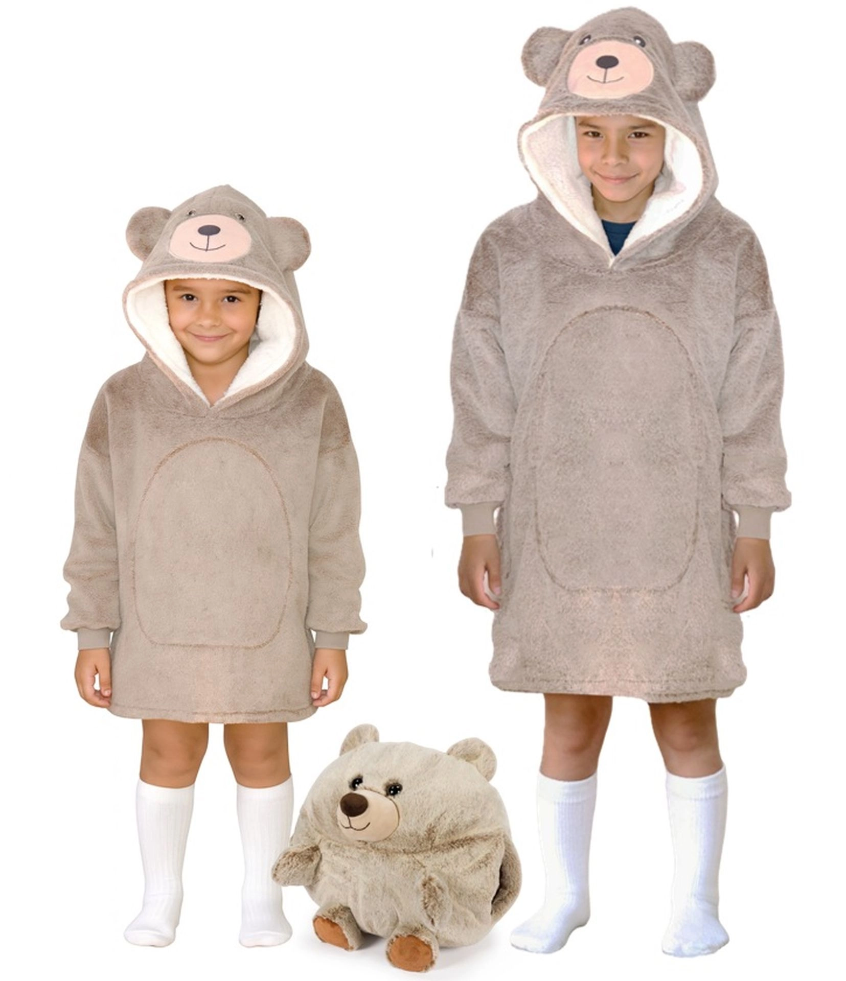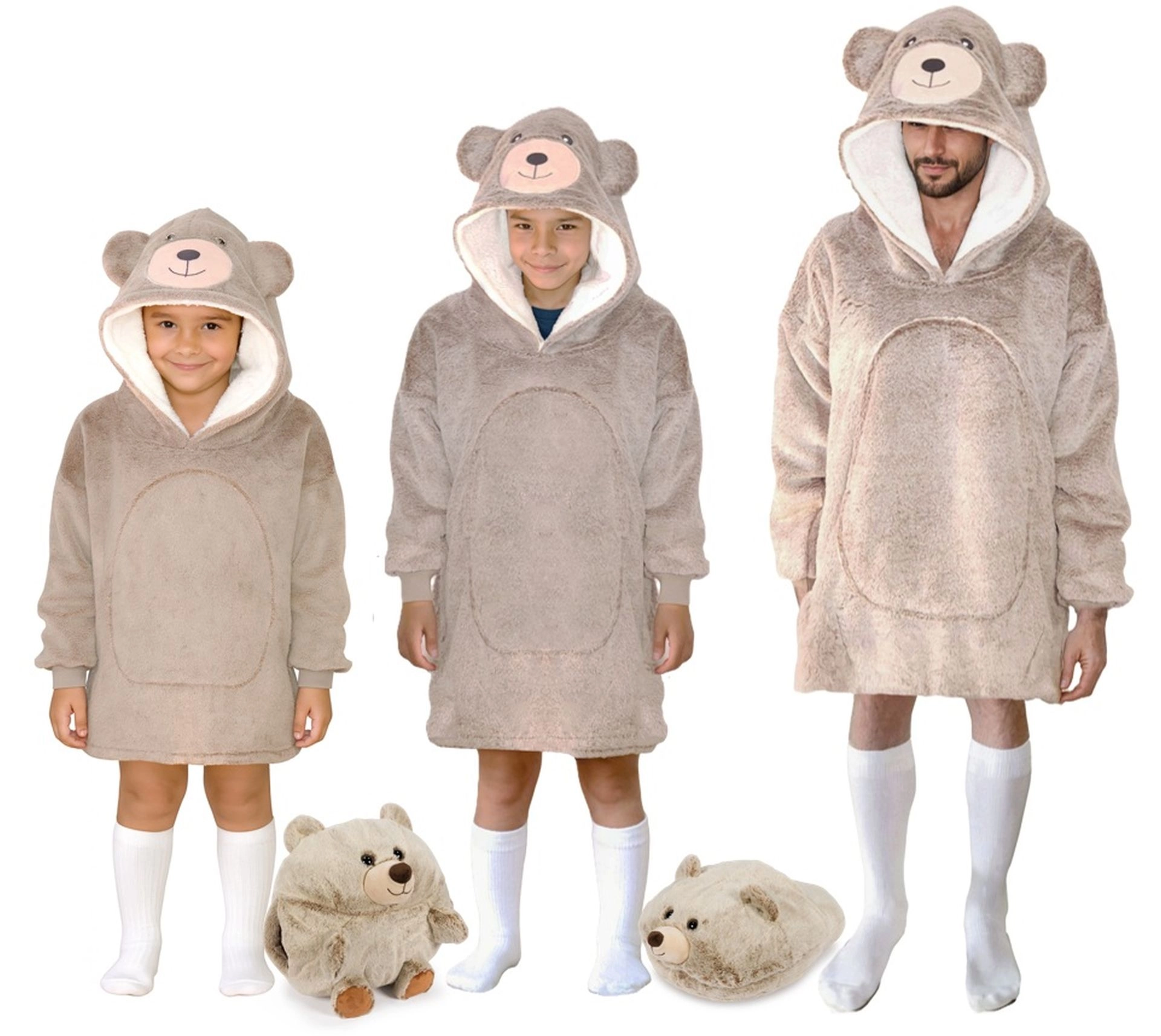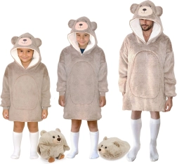 Χαριτωμένη και πρακτική κουβέρτα-φούτερ με κουκούλα σε στιλ αρκουδάκι για παιδιά 3–6 ετών. Προσφέρει υπερ-απαλό sherpa fleece εσωτερικά, βελούδινο φανελένιο εξωτερικό, oversize γραμμή για μέγιστη άνεση και μεγάλη μπροστινή τσέπη για ζέσταμα των χεριών. Ιδανική για χαλάρωση στον καναπέ, παιχνίδι και κάμπινγκ σε πιο δροσερό καιρό.