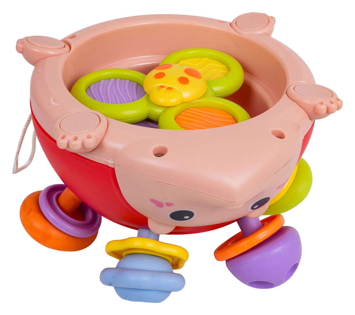- μαλακές υφές προεξοχές, κρίκοι που κουδουνίζουν, κεντρικό στοιχείο για πίεση/τράβηγμα, ελαστικά άκρα με λαστιχάκι, κάτω spinner, κορδονάκι για ανάρτηση