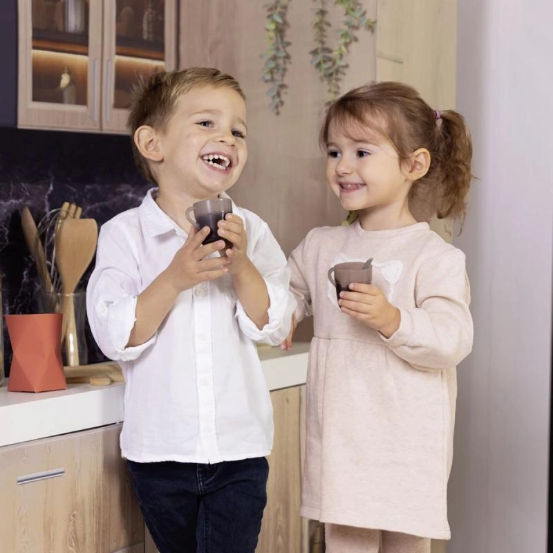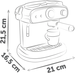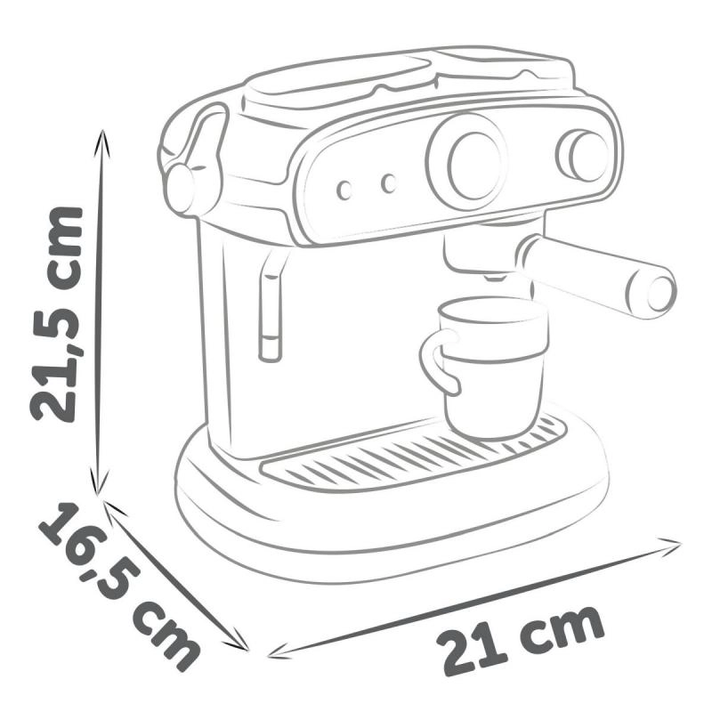 Το πρακτικό σετ περιλαμβάνει 2 φλιτζάνια, 2 κουταλάκια και 2 κάψουλες καφέ, ώστε τα παιδιά να μπορούν να σερβίρουν και φίλους ή αδέλφια. Οι συμπαγείς διαστάσεις 16,5 × 21 × 21,5 cm εξασφαλίζουν ότι η μηχανή χωράει σε κάθε παιδικό πάγκο κουζίνας.