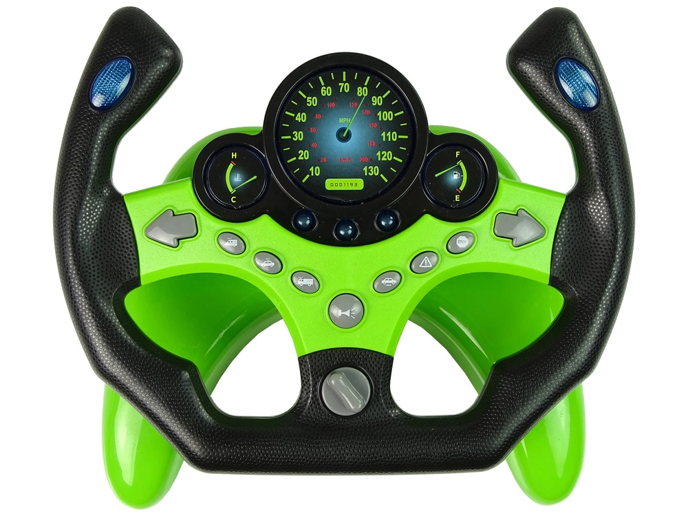 Αυτό το πράσινο–μαύρο παιδικό τιμόνι προσφέρει έως 9 λειτουργικά κουμπιά συμπεριλαμβανομένων φλας, κόρνας και ήχων υπηρεσιών έκτακτης ανάγκης. Με το γύρισμα του κλειδιού ανάβουν οι φωτιζόμενοι μπλε δείκτες και ο μικρός οδηγός μπορεί να βγει στον «δρόμο». Η σταθερή βάση με βεντούζες κρατά το τιμόνι γερά πάνω στην επιφάνεια του τραπεζιού.