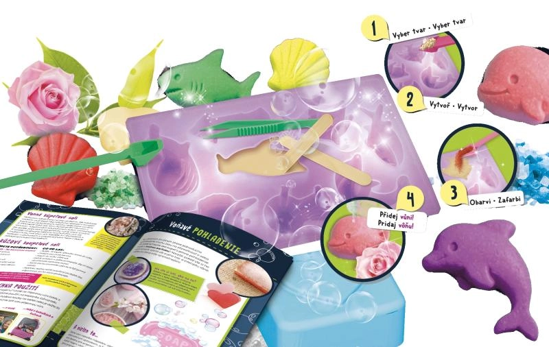 Αυτό το διασκεδαστικό και εκπαιδευτικό σετ σάς επιτρέπει να φτιάξετε εύκολα πρωτότυπα σαπούνια με μοτίβα θαλάσσιων πλασμάτων. Χάρη στα έτοιμα καλούπια και τις νιφάδες γλυκερίνης, η διαδικασία είναι απλή, ασφαλής και γρήγορη. Προσθέστε χρωματική essence και το αγαπημένο σας άρωμα και δημιουργήστε δώρα ή αρωματική διακόσμηση για το μπάνιο.