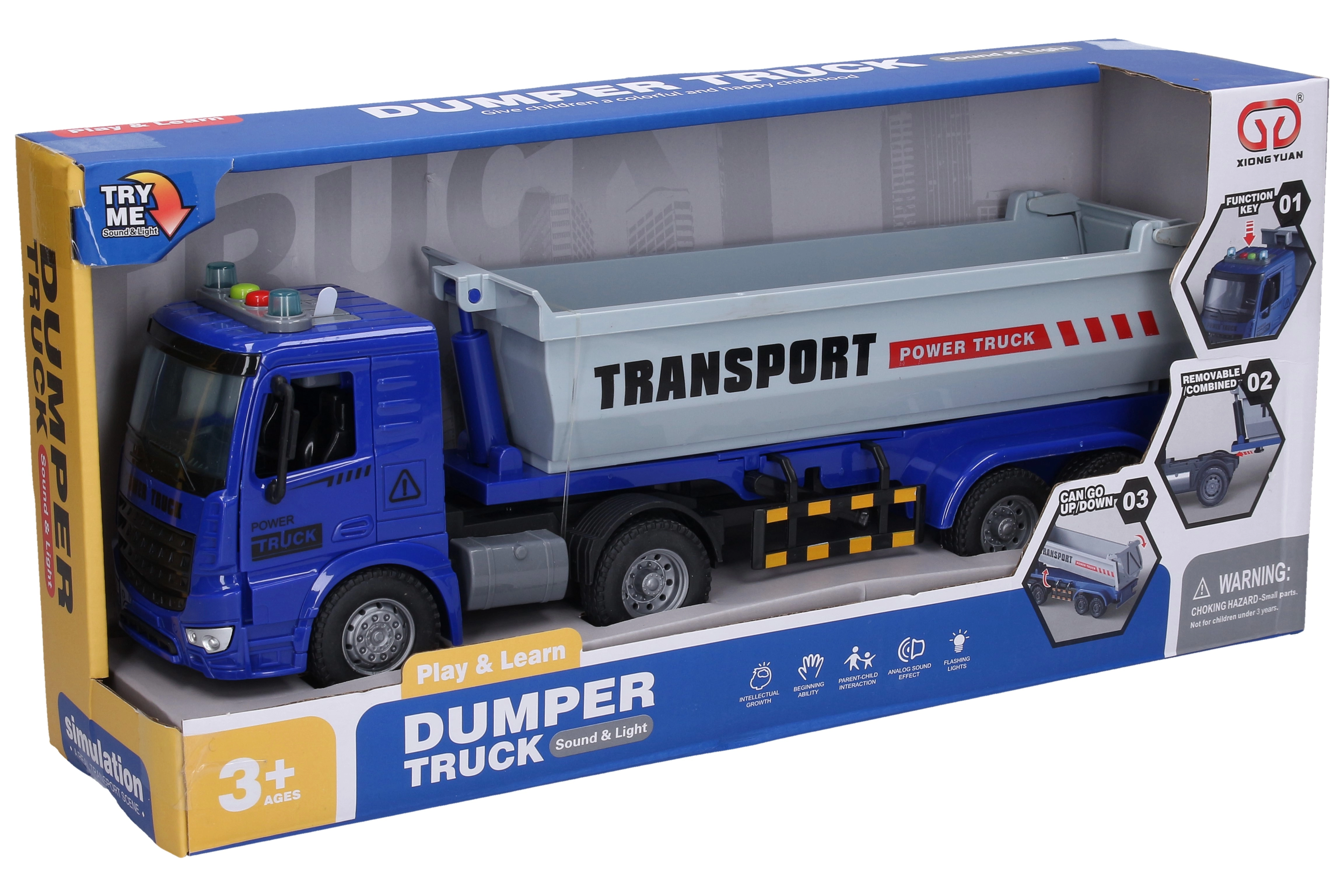 Ρεαλιστικό φορτηγό-ελκυστήρας με ανατρεπόμενη καρότσα που θα ενθουσιάσει μικρούς οδηγούς και συλλέκτες. Προσφέρει φωτεινά και ηχητικά εφέ, μηχανισμό αδράνειας για ομαλή κίνηση και ανοιγόμενες πόρτες. Χάρη στο αποσπώμενο τρέιλερ και τη λειτουργική ανατρεπόμενη καρότσα, τα παιδιά θα ζήσουν άφθονη διασκέδαση και θα αναπτύξουν τη φαντασία τους στο παιχνίδι.