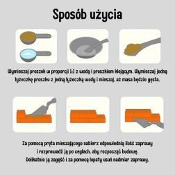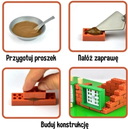 Ο χειρισμός είναι εύκολος: αναμείξτε τη σκόνη με νερό 1:1, απλώστε το κονίαμα με σπάτουλα και τοποθετήστε τα τούβλα στρώση προς στρώση. Το έτοιμο σπίτι μπορεί, για επαναχρησιμοποίηση, να βυθιστεί σε ζεστό νερό για 1–3 ώρες – το κονίαμα διαλύεται και τα κομμάτια χρησιμοποιούνται ξανά. Τα παιδικά εργαλεία στη συσκευασία διδάσκουν σωστές κινήσεις και αναπτύσσουν τη λεπτή κινητικότητα.