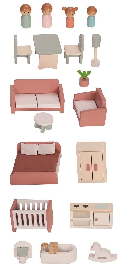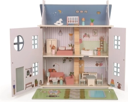 Το κουκλόσπιτο είναι κατασκευασμένο από ποιοτικό ξύλο και εμπλουτισμένο με υφασμάτινα και τσόχινα στοιχεία. Περιλαμβάνει έπιπλα και φιγούρες, ώστε τα παιδιά να ξεκινούν να παίζουν αμέσως. Τα ανοιγόμενα πάνελ διευκολύνουν την πρόσβαση στο εσωτερικό και τα λεπτομερή γραφικά των δωματίων ενισχύουν το ρεαλιστικό παιχνίδι. Η στιβαρή κατασκευή εξασφαλίζει μεγάλη αντοχή και ασφαλή χρήση.