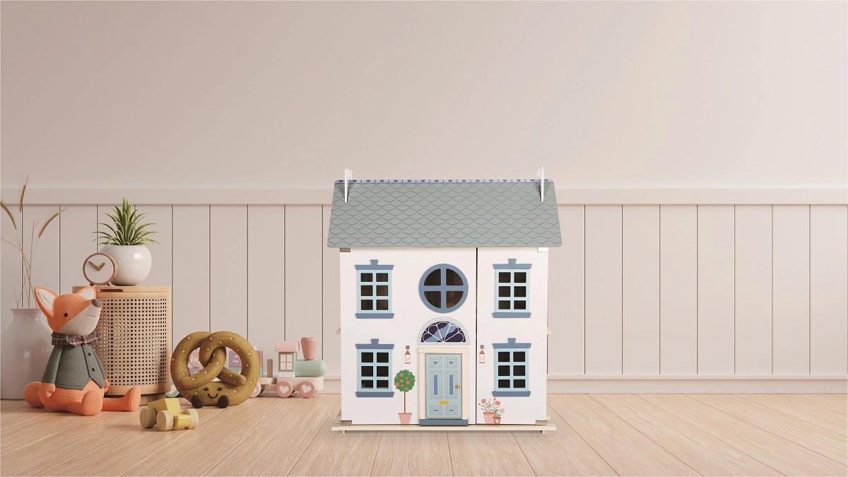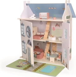 Αυτό το διαχρονικό ξύλινο κουκλόσπιτο έχει σχεδιαστεί για φανταστικό παιχνίδι παιδιών από 3 ετών. Προσφέρει τρία επίπεδα με ευρύχωρα δωμάτια – μοντέρνα κουζίνα, μπάνιο, ζεστή κρεβατοκάμαρα, σαλόνι και παιδικό δωμάτιο στο πατάρι. Το μπροστινό μέρος της στέγης μπορεί να αφαιρεθεί, να γυρίσει και να τοποθετηθεί μπροστά από το σπίτι, δημιουργώντας κήπο με πισίνα και καθιστικό.