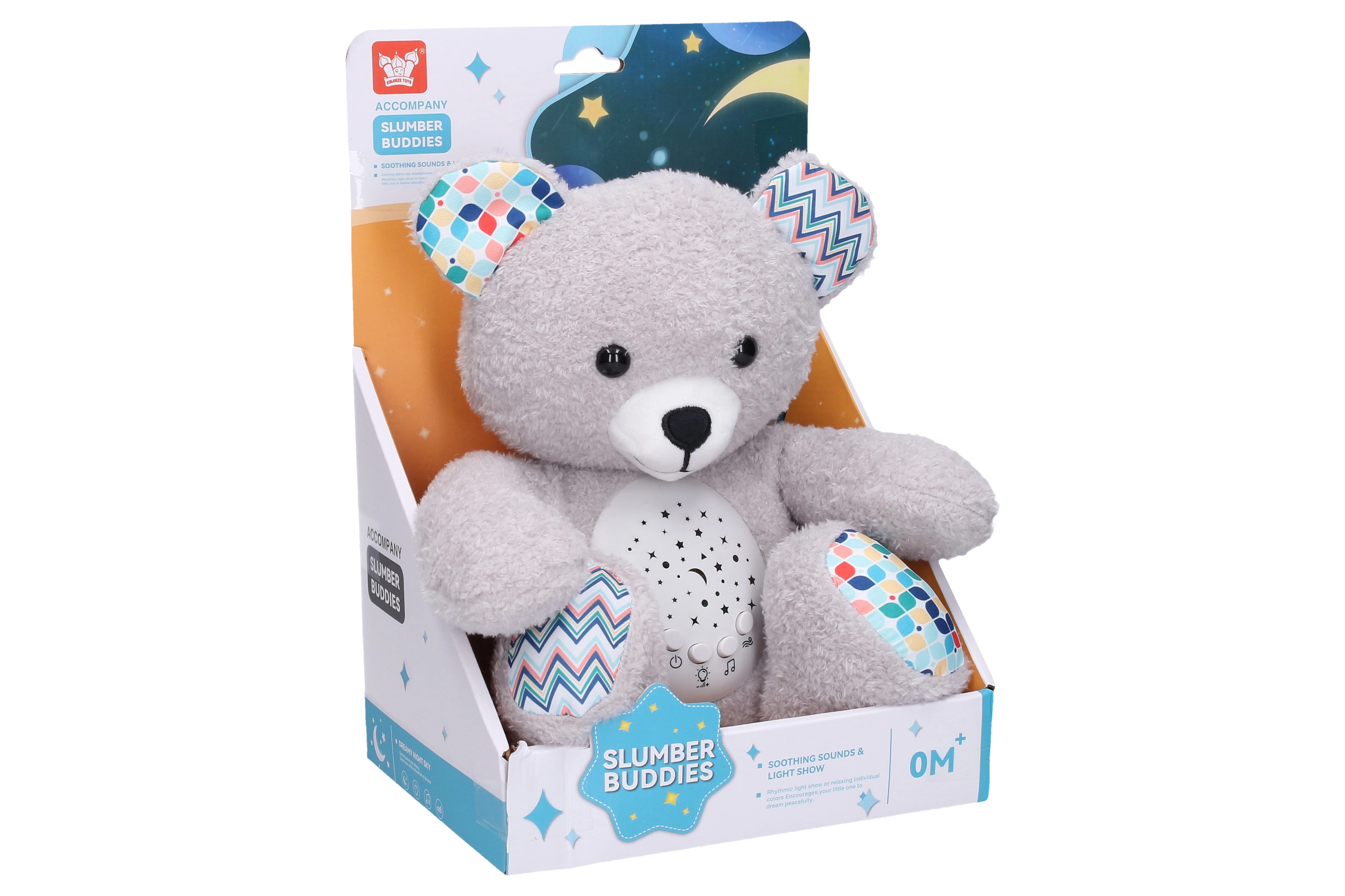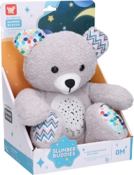 Αυτό το απαλά μαλακό αρκουδάκι ύπνου με προβολή είναι ιδανικός σύντροφος για τις βραδινές ρουτίνες. Χάρη στον αποσπώμενο προβολέα προβάλλει απαλό φως με τρία επίπεδα φωτεινότητας και βοηθά στη δημιουργία ευχάριστης ατμόσφαιρας για ύπνο. Διαθέτει 7 χαλαρωτικά νανουρίσματα και 3 είδη λευκού θορύβου, τα οποία αλλάζουν εύκολα με ένα μόνο πάτημα.