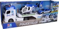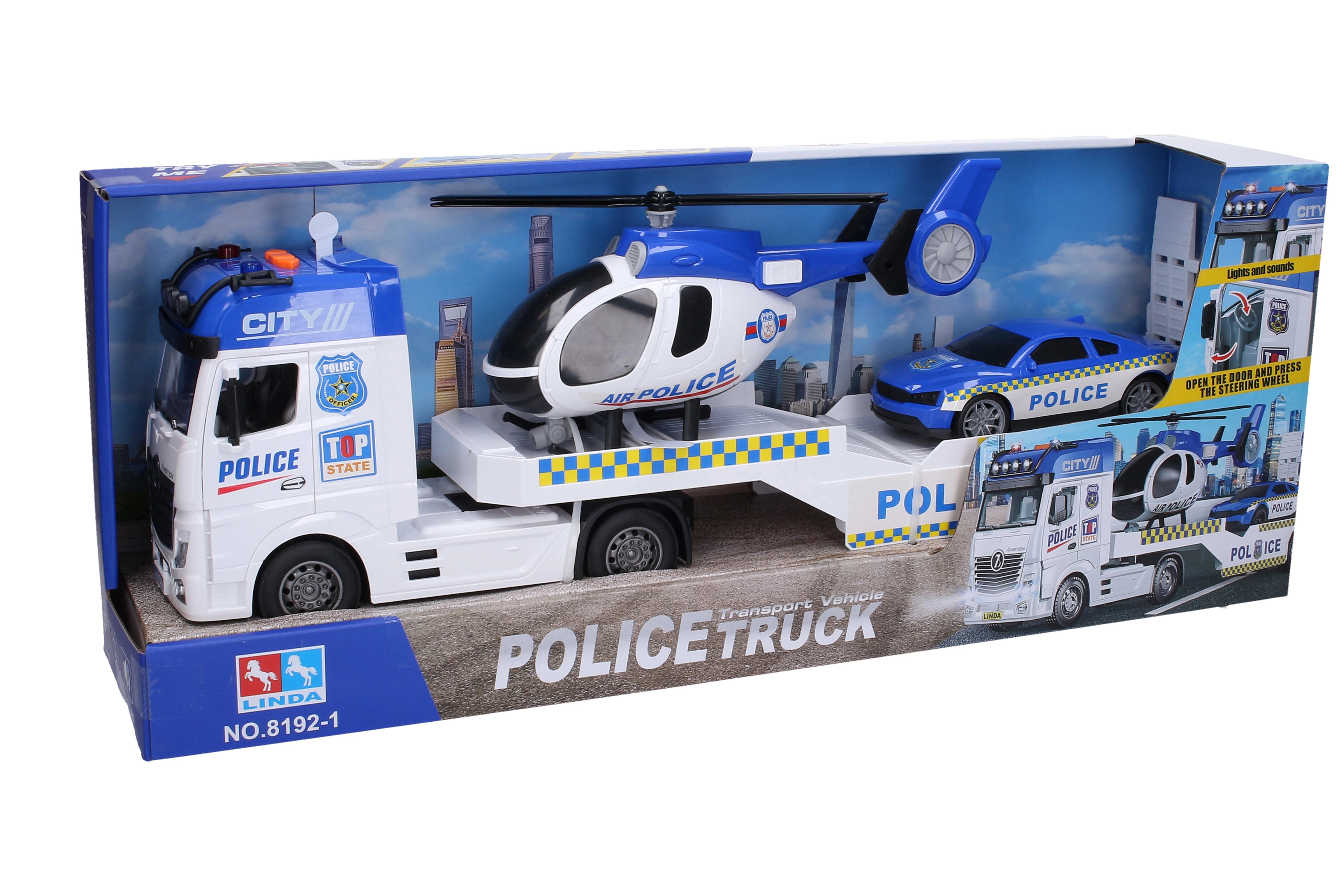 Δράση για μικρούς διασώστες: αστυνομικός ελκυστήρας 55 cm με ελικόπτερο 27 cm και αστυνομικό αυτοκίνητο 16 cm προσφέρει άφθονη διασκέδαση χάρη στα φωτεινά και ηχητικά εφέ. Ο ελκυστήρας είναι με αδράνεια, η ενεργοποίηση των εφέ γίνεται με κουμπιά. Περιλαμβάνονται μπαταρίες, ώστε τα παιδιά να μπορούν να παίξουν αμέσως μετά το άνοιγμα.